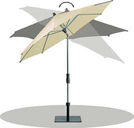 Die Bedienung ist besonders komfortabel: Mit der Kurbel lässt sich das Schirmdach mühelos öffnen und schließen. Über den Twist-Drehknopf oberhalb der Kurbel kann das Dach zusätzlich stufenlos geneigt werden – so genießen Sie jederzeit optimalen Schutz, auch bei tiefstehender oder seitlich einfallender Sonne.