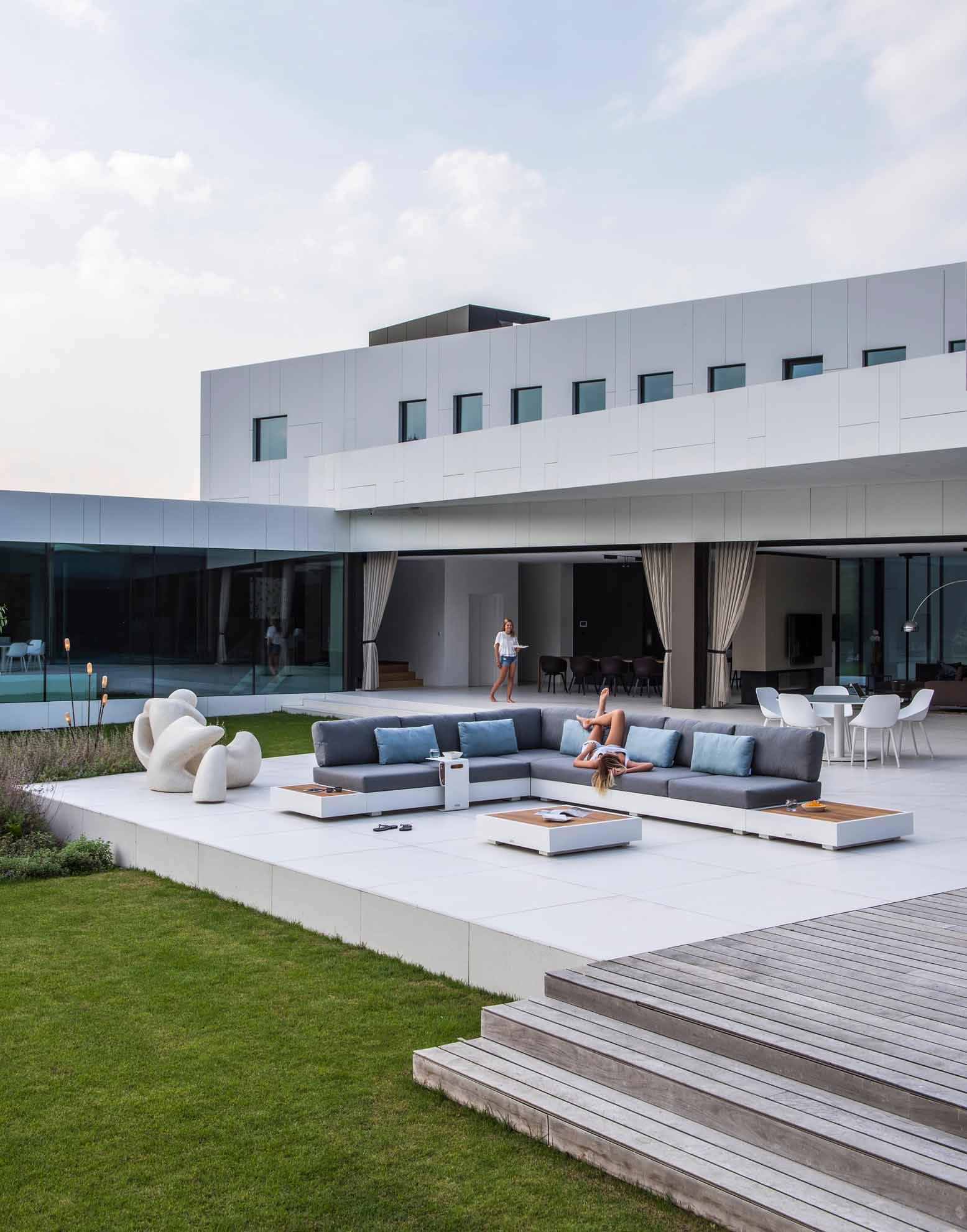 Das Bari Loungemodul von Jati & Kebon ist ein vielseitig verwendbares 3-Sitzer Sofa. Es kann als Liege oder Sofa freistehend genutzt werden, ist aber auch mit zusätzlichen Modulen zu einer Sitzgruppe über Eck erweiterbar. Rückenlehnen, sowie Sitz- und Rückenkissen sind separat im Zubehör bestellbar. Bari Module haben den Vorteil, daß man sie in 3 unterschiedlichen Höhen montieren kann und so lässt sich immer eine bequeme Sitzhöhe finden. Material/Farbe: Aluminium, Pulverbeschichtung in "eisengrau" Maße: B 270cm T 90cm Sitzhöhe (verstellbar, ohne Kissen) 22cm, 27cm, 32cm