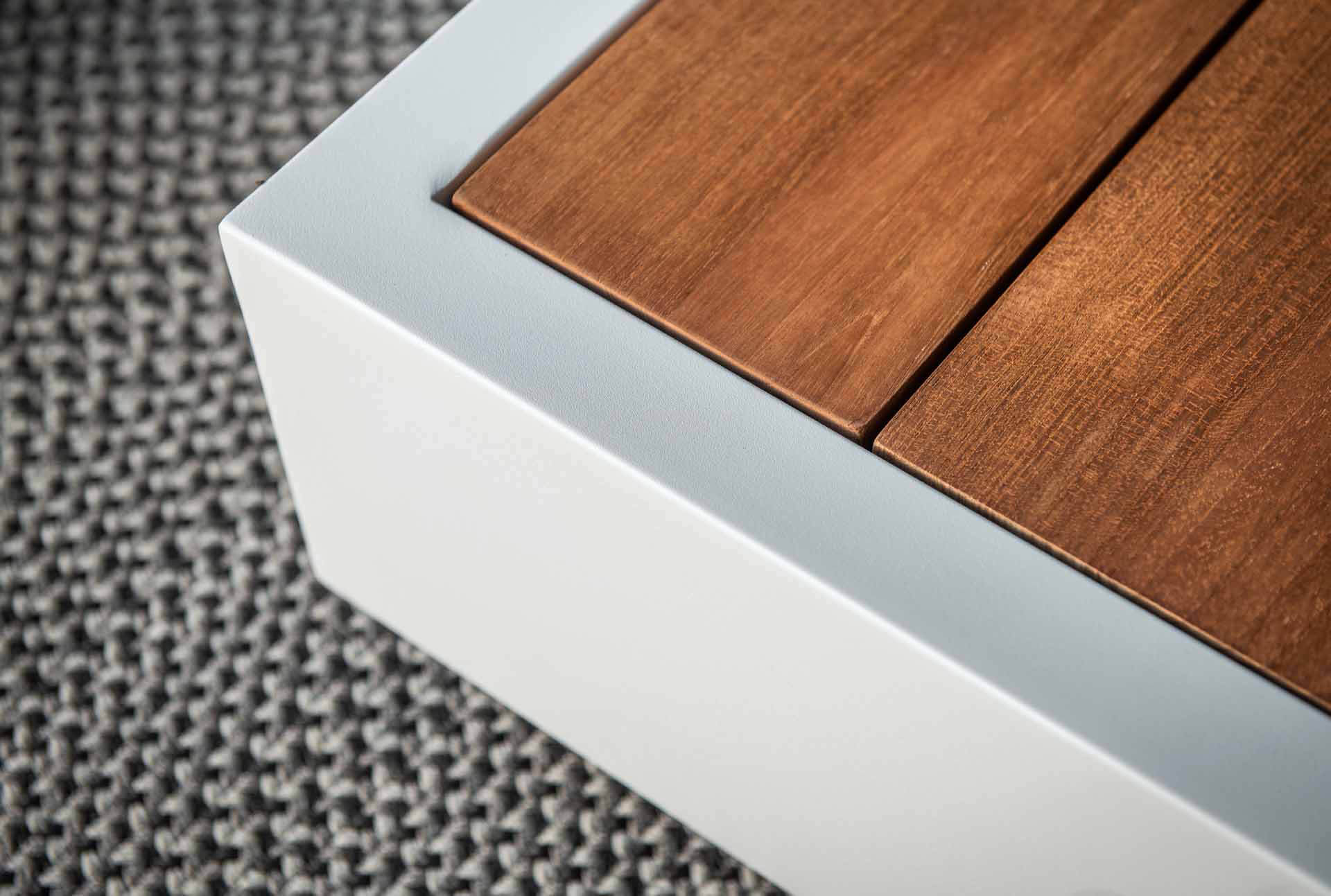Rechteckiger Bari Kaffeetisch zum Anschrauben an ein vorhandenes Loungemodul. Rahmen Aluminium eisengrau matt, Abstellfläche aus Teakholz