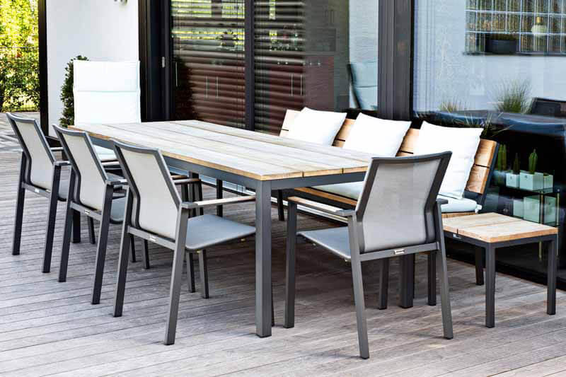 Wir verwenden ausschließlich Teakholz aus kontrolliertem Anbau. Teakholz gehört zu den wertvollsten Nutzhölzern der Welt. Ein hoher Kautschukgehalt bewirkt unter anderem eine starke Wasserabweisung. Das Holz widersteht nicht nur problemlos Nässe, Sonne, Frost und Temperaturschwankungen, sondern besitzt auch eine hohe Resistenz gegen Ungeziefer und Insekten. Teakholz ist zum Dauereinsatz im Freien besonders geeignet. Die meisten Teakmöbel werden naturbelassen geliefert. Im Laufe der Zeit bekommt das Holz durch Witterungseinflüsse eine silbergraue Patina.