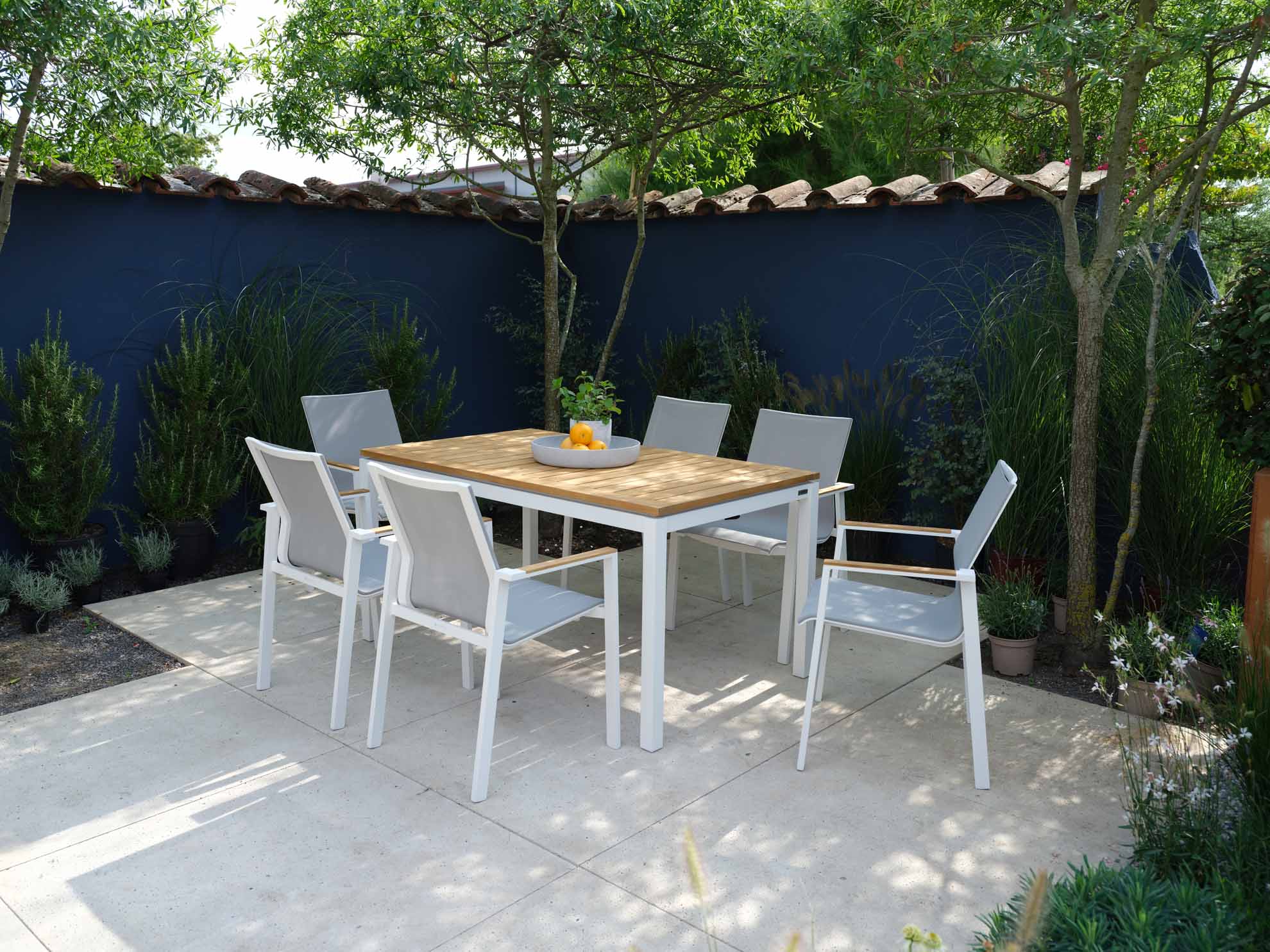 Wir verwenden ausschließlich Teakholz aus kontrolliertem Anbau. Teakholz gehört zu den wertvollsten Nutzhölzern der Welt. Ein hoher Kautschukgehalt bewirkt unter anderem eine starke Wasserabweisung. Das Holz widersteht nicht nur problemlos Nässe, Sonne, Frost und Temperaturschwankungen, sondern besitzt auch eine hohe Resistenz gegen Ungeziefer und Insekten. Teakholz ist zum Dauereinsatz im Freien besonders geeignet. Die meisten Teakmöbel werden naturbelassen geliefert. Im Laufe der Zeit bekommt das Holz durch Witterungseinflüsse eine silbergraue Patina.