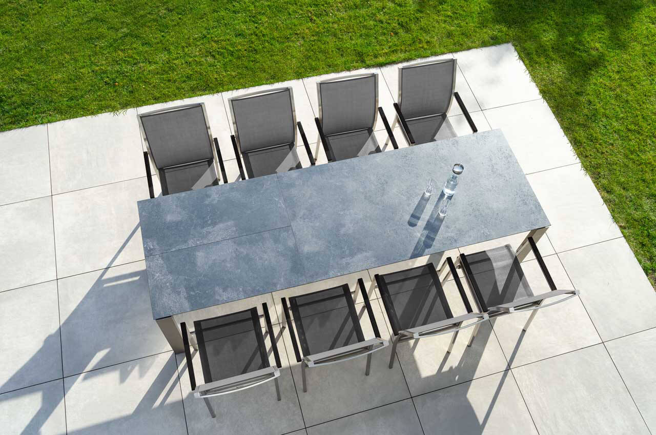 In Bezug auf Design sticht der exklusive Bologna Ausziehtisch von Jati & Kebon mit ganz besonderer Finesse hervor. Auf den rechteckigen Tischbeinen scheint die Tischplatte zu schweben und der silberfarbene Rahmen ergibt einen eindrucksvollen und modernen Kontrast. Im Grundmaß hat der Tisch die Größe 220x95cm und ist um 100cm verlängerbar auf 320x95cm. Das besondere an Bologna Tischen ist die Ausziehtechnik: Durch die Form der Unterkonstruktion lässt sich der Rahmen mit den Tischbeinen verschieben, deshalb hat die Tischplatte keinen Überhang. So stört kein Tischbein an der Tafel und darüber hinaus ist der Bologna Tisch in ausgezogener Größe eine imposante Erscheinung. Das Gestell besteht aus Aluminium mit einer Pulverbeschichtung in der Farbe weiß-matt. Die 3-teilige Tischplatte ist aus HPL im Design zement grau. Die Tischgröße eignet sich für 10-12 Sitzplätze.
