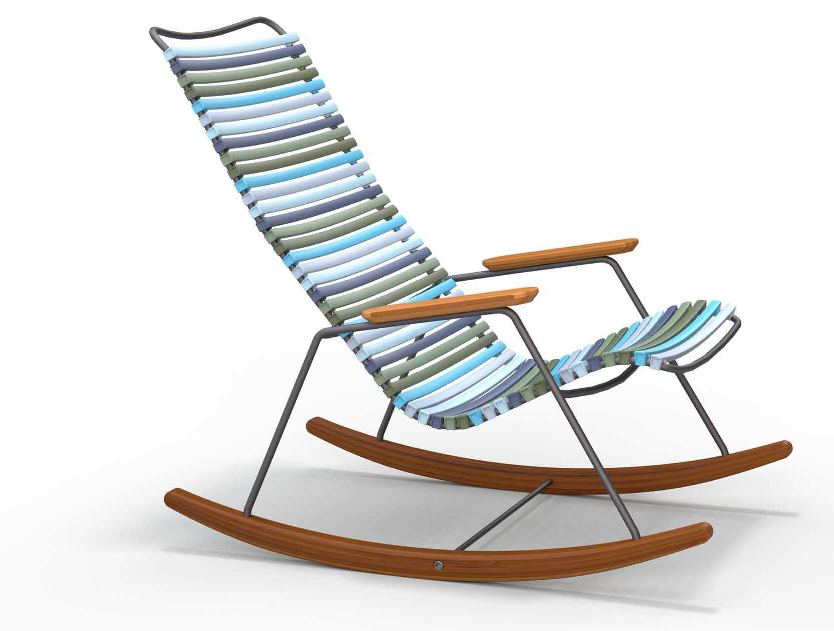 Die meisten Menschen sitzen gerne in einem Schaukelstuhl. Der Körper kommt in der dynamischen Schaukelbewegungen zur Ruhe und es lässt sich kaum sanfter entspannen. Der Schwingstuhl ist wieder in Mode gekommen und wird in neuen Formen und Materialien zum Highlight der Terrasse. Houe hat den modernen Click Rocking Chair entworfen in einem ansprechendem, frischen Design das zum hineinsetzen einlädt. Das Gestell besteht aus grauem, pulverbeschichtetem Stahl und die Lamellen aus Kunststoff im Farbmix " multi color1 ". Die Armlehnen und Kufen sind aus Bambus hergestellt und geben dieser spannenden Materialkombination seine besondere Note. Genießen Sie den angenehmen Sitzkomfort in einem Click Schaukelstuhl . Farbe: 83 multi colour 1  Art.NR.: 10804-8318