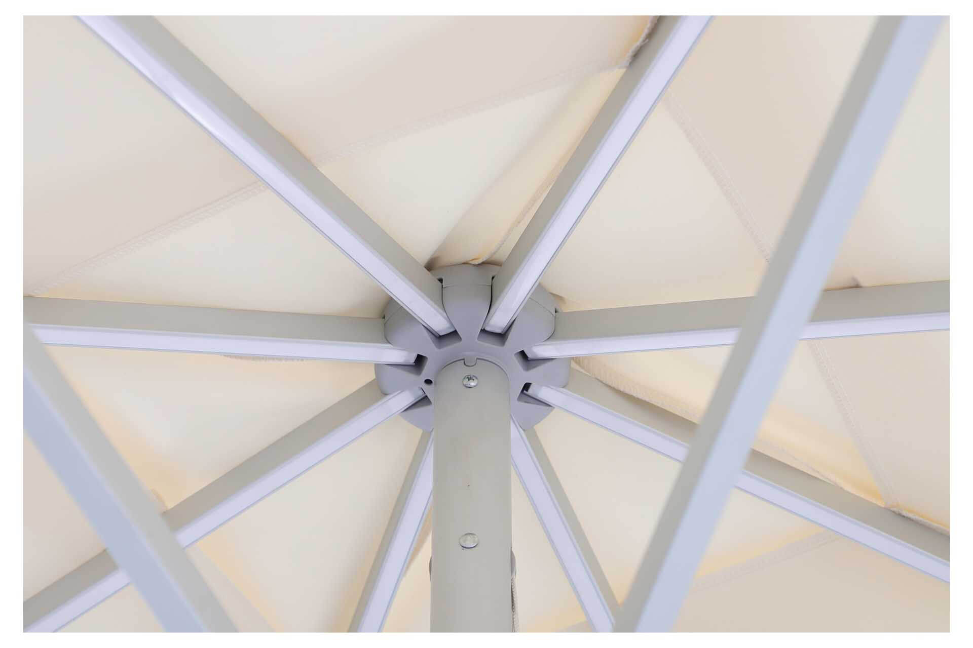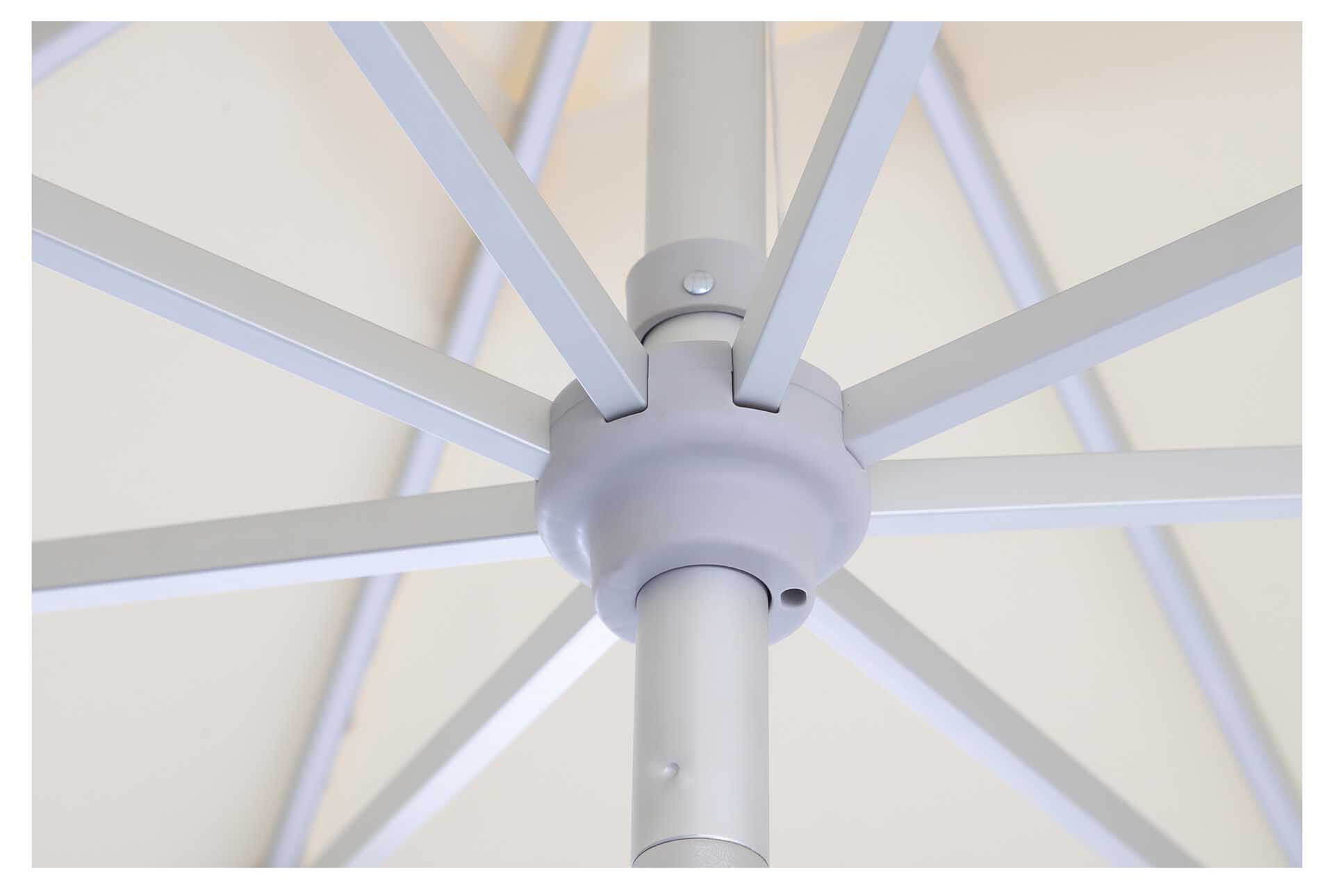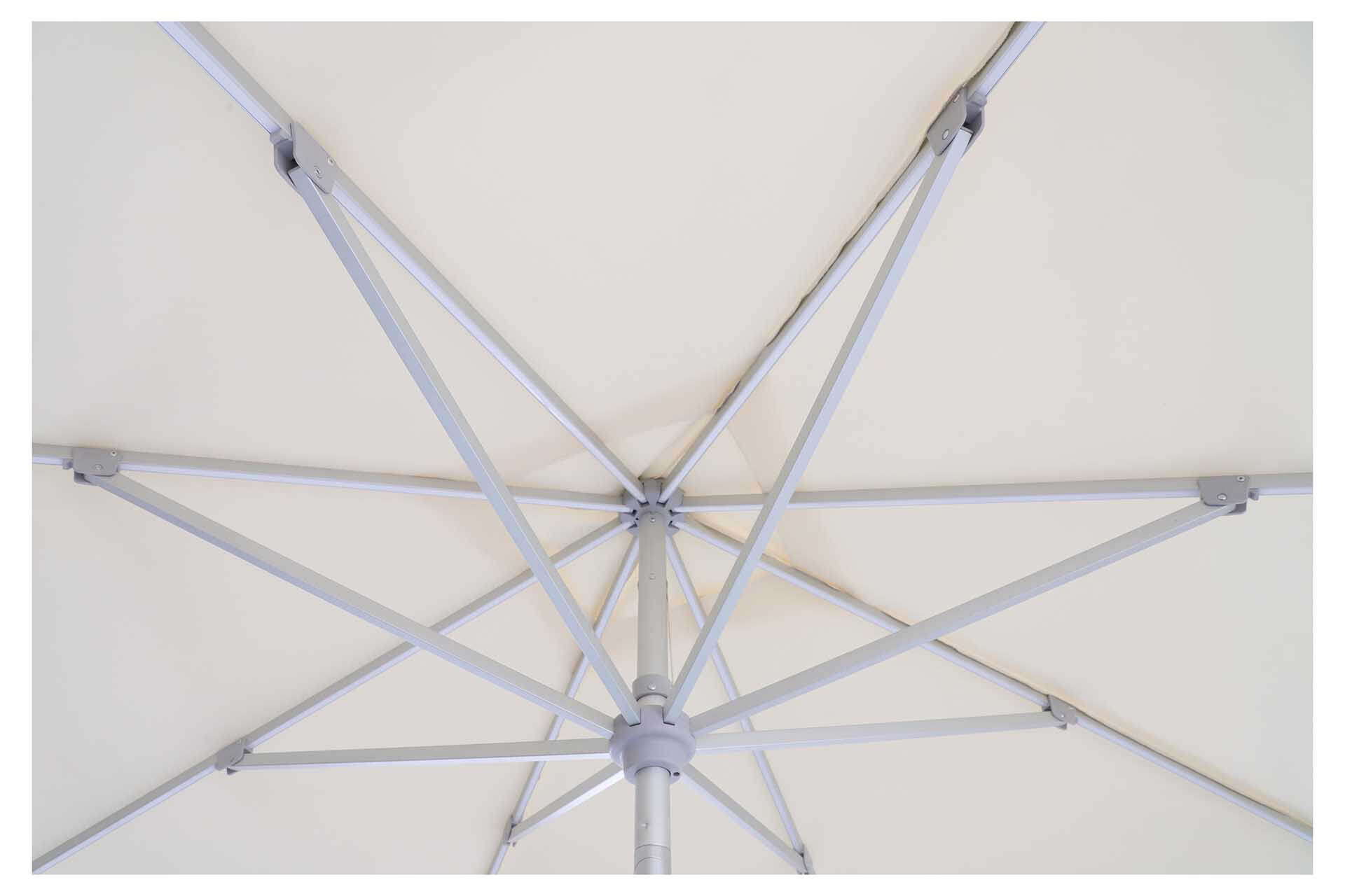 • UNO: eloxirtes Aluminium, Streben 14×20 mm, selbstspannende Strebenenden für ein dauerhaft straffes Schirmdach.
