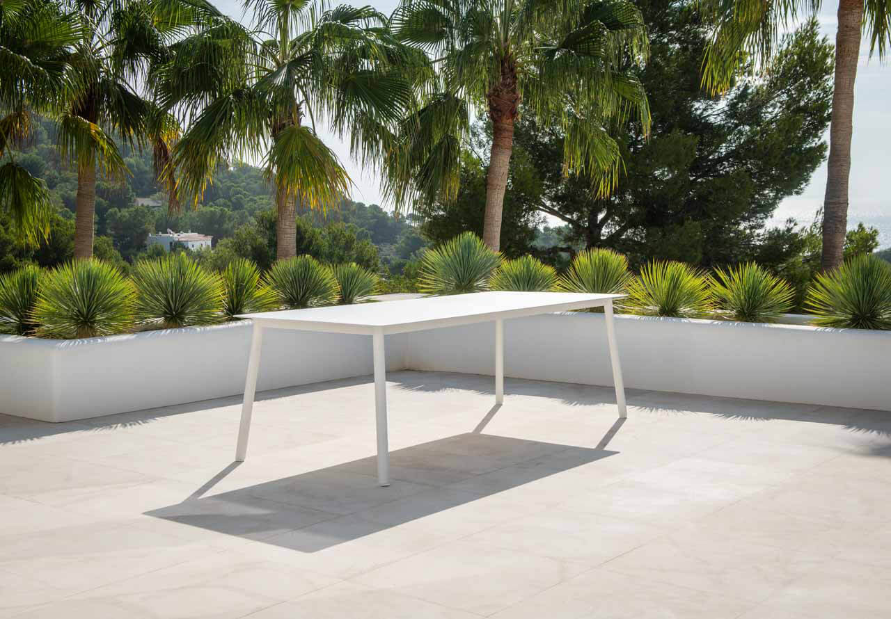Das Tischgestell aus der Serie Durham von Jati & Kebon ist vorgesehen für nicht ausziehbare Tischplatten der Größe 220x100cm deren Ecken abgerundet sind. Die Oberfläche besteht aus einer Pulverbeschichtung in der Farbe „eisengrau“. Eine große Anzahl an Tischplatten in unterschiedlichen Materialien und Farben ermöglicht Ihnen die Gestaltung eines ganz persönlichen Gartentisches. Platten aus HPL, Dekton® oder Keramik sind wetterfest und deshalb bestens für den Aussenbereich geeignet. Wählen Sie einfach eine Farbe nach Ihrem ganz persönlichem Geschmack. Maßgefertigte Schutzhüllen sind ebenfalls für diese Größe erhältlich und können als Zubehör mitbestellt werden. Der Tisch bietet Platz für 6-8 Personen.