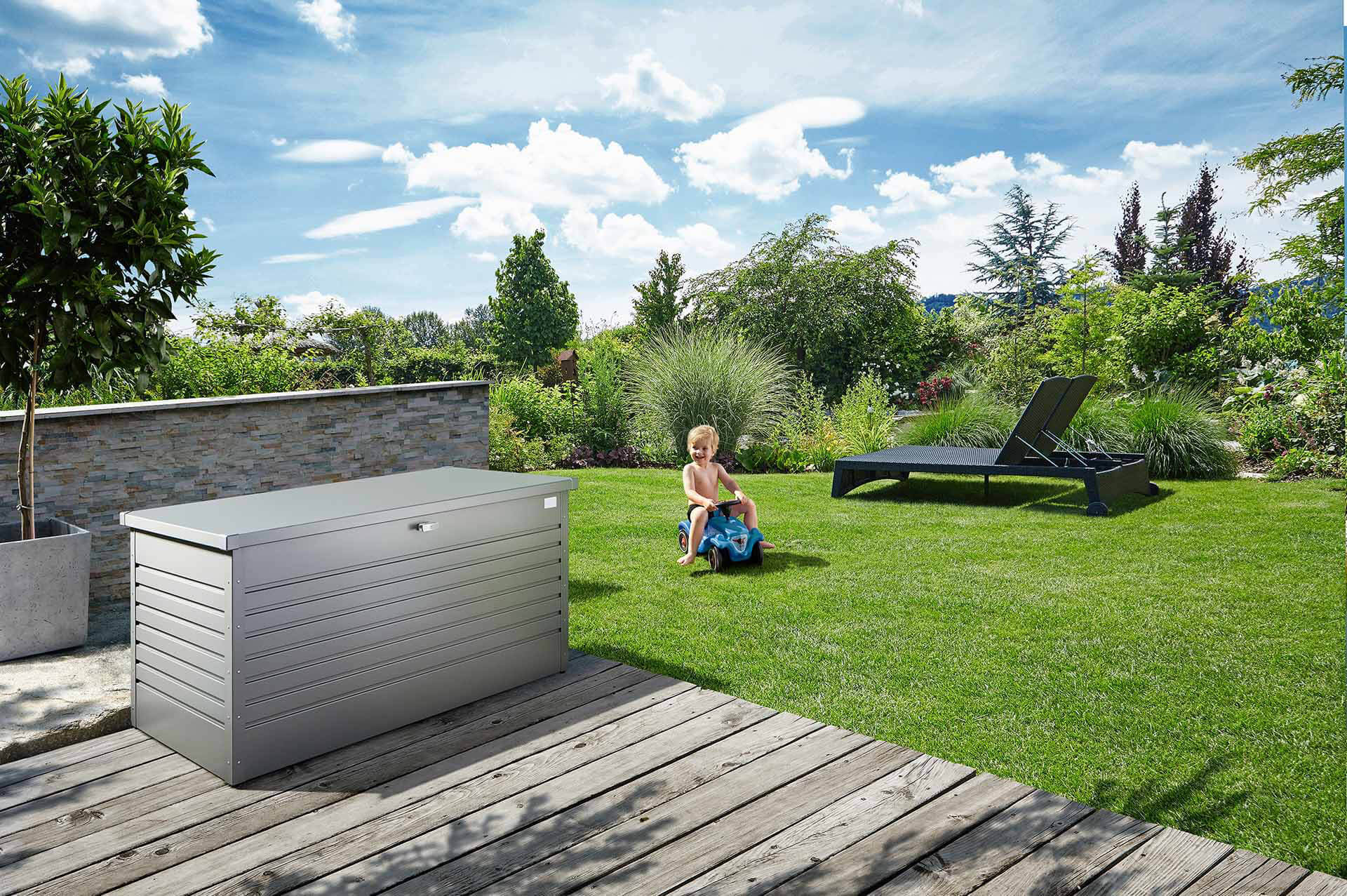 Die Kissenbox von Biohort ist der ideale Aufbewahrungsort für die Dinge, die sonst keinen Platz finden. Die eindrucksvolle Optik ist garantiert ein Highlight auf jeder Terrasse. Bestens geeignet für Sitzkissen, Spielzeug, Sportutensilien und vieles mehr. Die Box ist regendicht und die unsichtbare Durchlüftung vermeidet Schimmelbildung. Der abschließbare Deckel mit Scharnieren aus Edelstahl lässt sich leicht durch Gasdruckfedern öffnen. Die Freizeitbox hat die Maße 181x79x71cm und besteht aus feuerverzinktem Stahlblech mit einer Polyamid-Einbrennlackierung in "dunkelgrau-metallic" . Die Freizeitbox 180 ist wartungsfrei und der Hersteller gewährt eine Garantie von 20 Jahren. Artikel-Nr.:65030