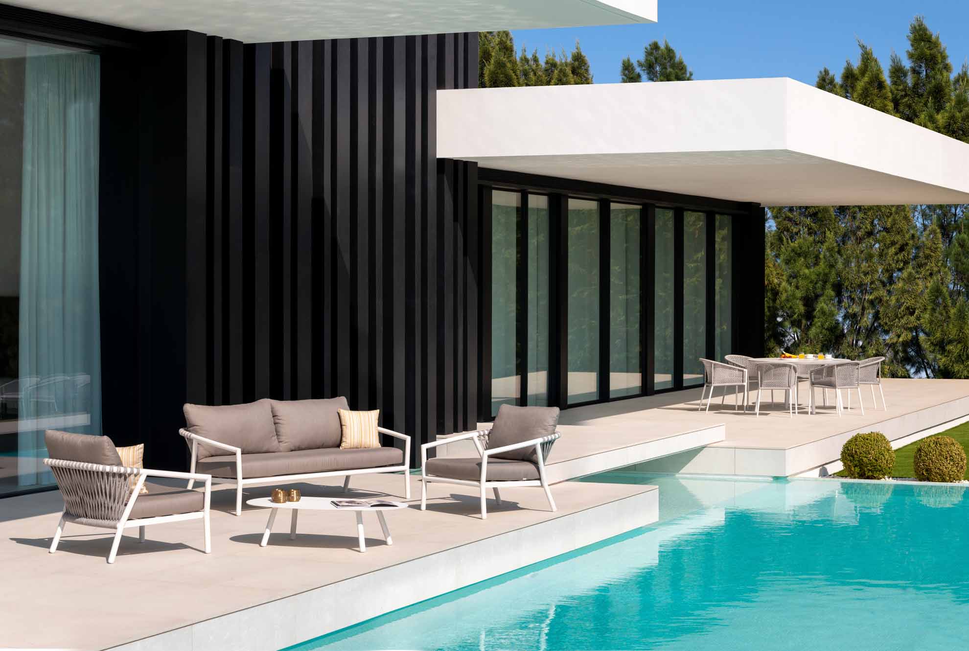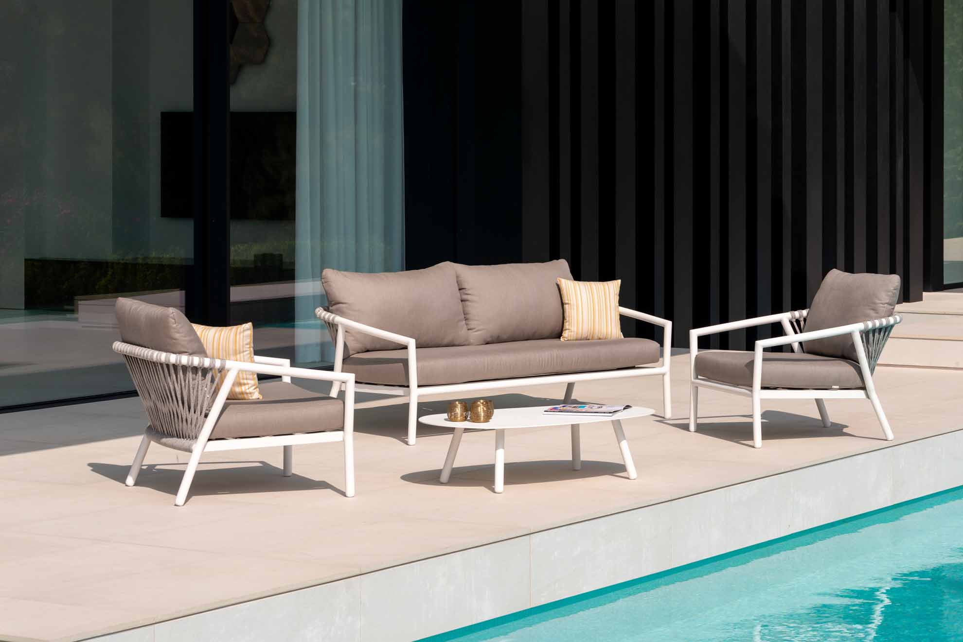 Seilmöbel - Qualitätsfasern mit natürlichem Aussehen. Die Polyolefinfaser hat ein natürliches Aussehen, ist jedoch pflegeleicht und unempfindlich gegen die Kräfte von Mutter Natur. Das Seil ist sowohl für den Innen- als auch für den Außenbereich geeignet. Wie keine andere synthetische oder natürliche Faser ist sie resistent gegen Pilze, Bakterien, Sonnenlicht, Feuchtigkeit, Chlor, Lebensmittelflecken und Schweiß. Es ist extrem leicht, waschbar, umweltfreundlich und vollständig recycelbar. Kombinieren Sie die Sitze und Stühle aus Rope-Geflecht mit maßgeschneiderten, wetterbeständigen Kissen.