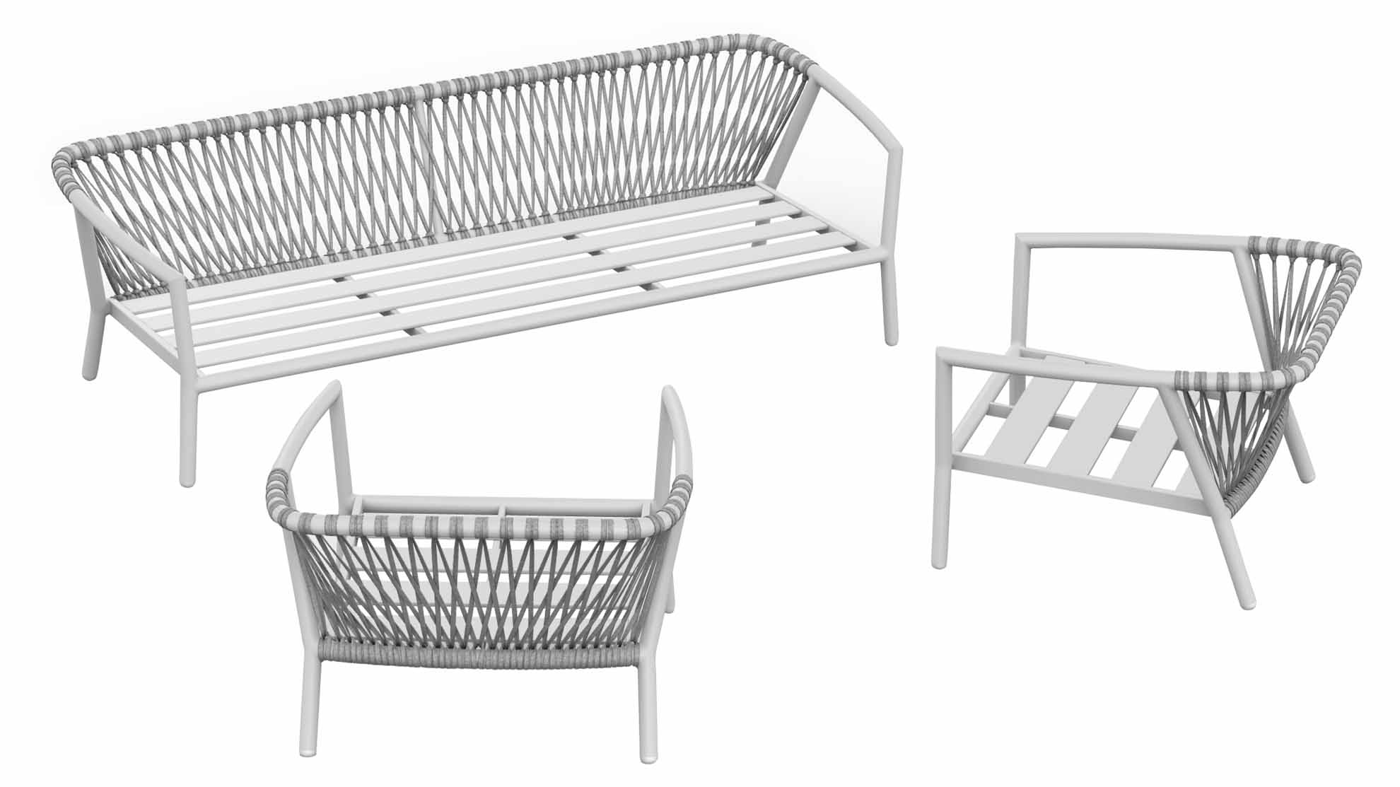 Kapra von Jati&Kebon zeigt, wie apart und wohnlich eine Lounge-Garnitur sein kann. Das Design ist zurückhaltend und wirkt doch sehr elegant. Die Struktur des 1-Sitzer Lounge Sessels besteht aus einem robusten Aluminiumrahmen in Rundform mit einer Sitzfläche aus rechteckigem Aluminiumprofilen. Die Oberflächen sind pulverbeschichtet in der Farbe weiß-matt. Die Pulverbeschichtung bietet im Gegensatz zu einer herkömmlichen Lackierung einen wesentlich höheren Schutz gegen Verwitterung und Beschädigungen und sorgt für eine langjährige Haltbarkeit. Die Bespannung besteht aus Rope in der Farbe light grey melange. Rope-Geflecht besteht zu 100% aus Polyolefinfasern, dieses Material nimmt keinerlei Feuchtigkeit auf, ist UV-Beständig und fühlt sich zudem auch sehr weich an. Dieser Materialmix macht Kapra daher zu pefekten Outdoor-Möbeln.