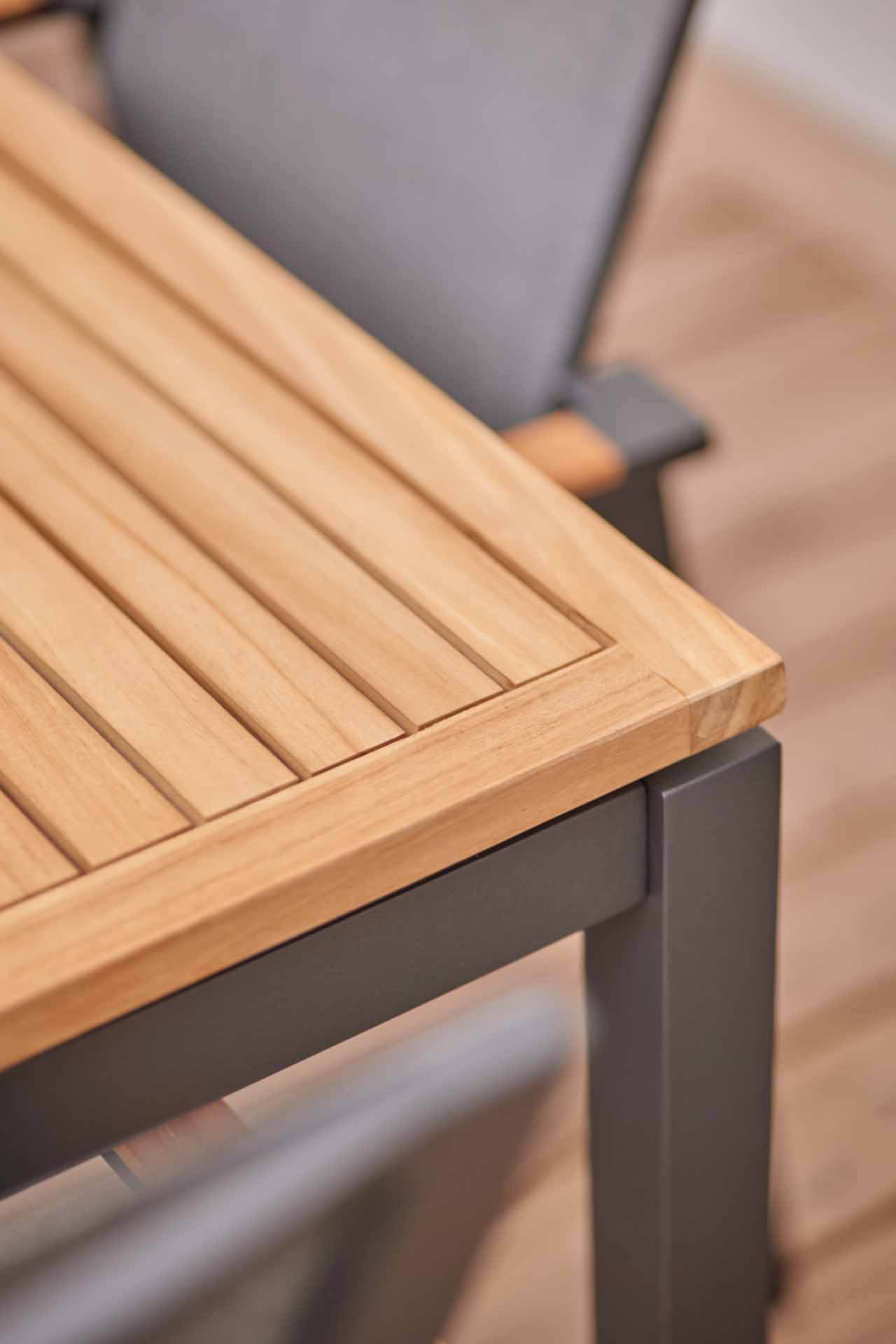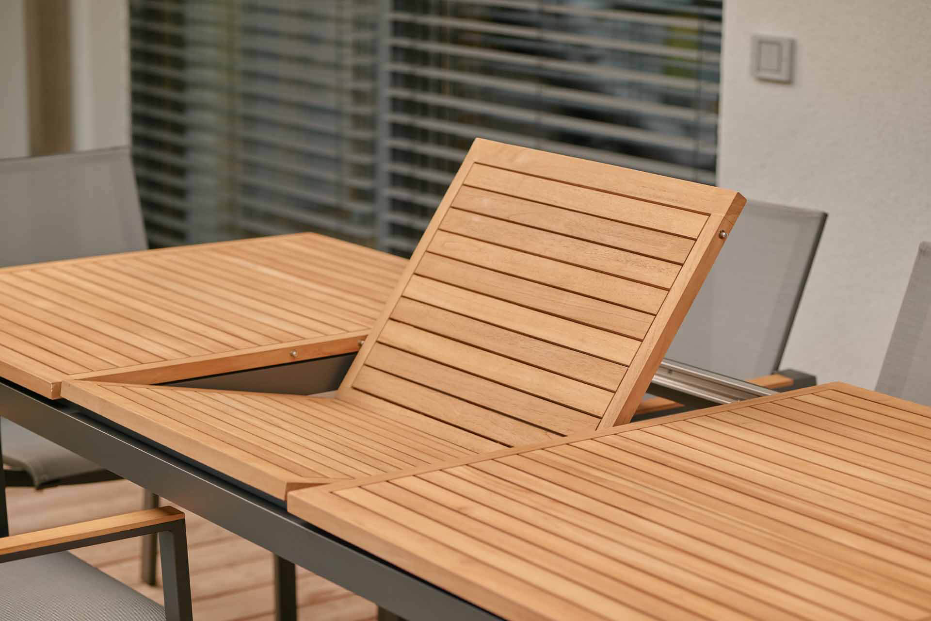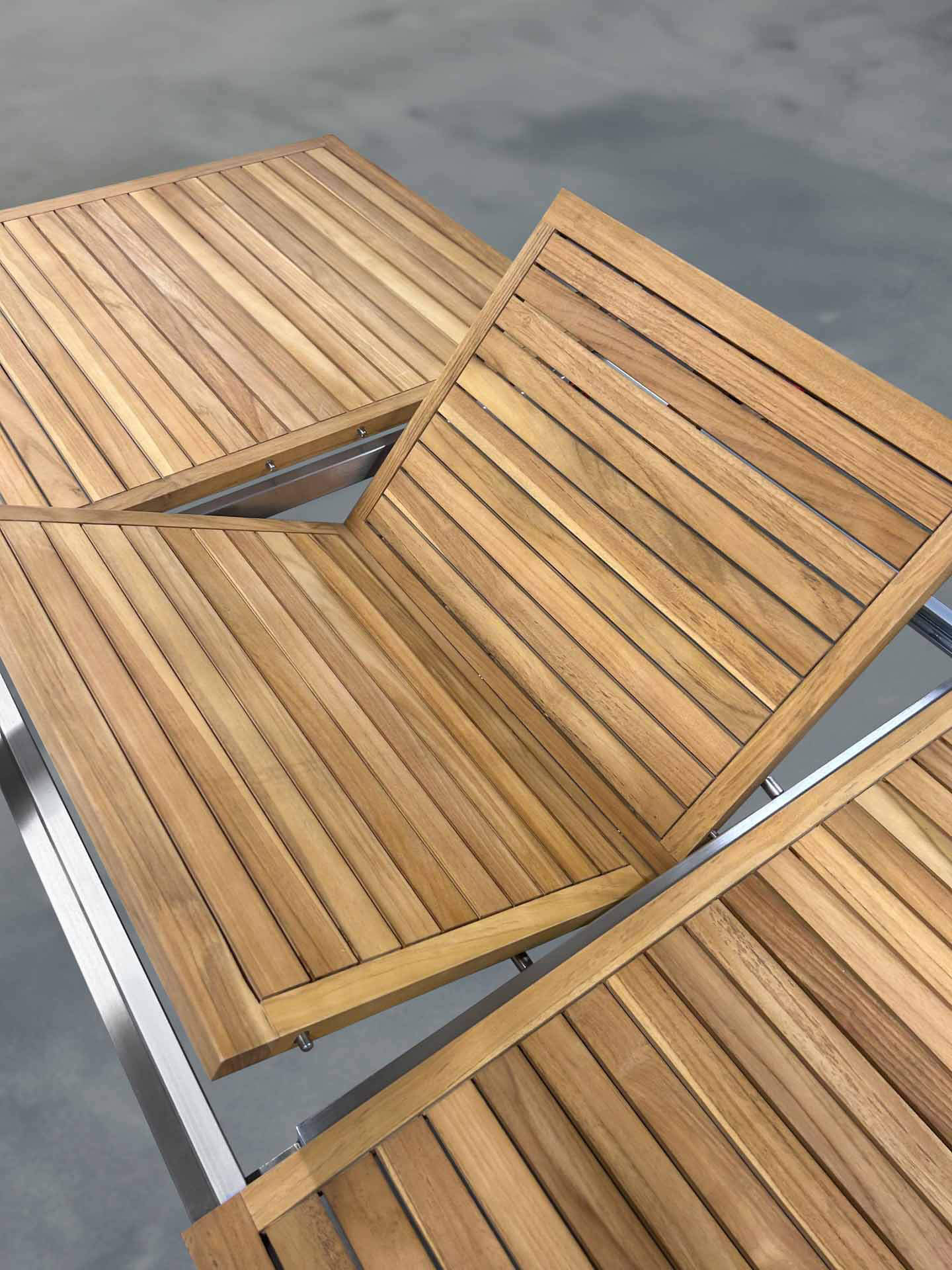 Die Tischplatte des Kreta Ausziehtischs ist aus hochwertigem Teakholz gefertigt. Teakholz ist bekannt für seine Widerstandsfähigkeit gegenüber den Elementen und sein zeitloses Erscheinungsbild. Es ist eine hervorragende Wahl für Gartenmöbel, da es nicht nur robust ist, sondern auch natürliche Schönheit und Wärme ausstrahlt. Die natürliche Maserung des Teakholzes verleiht dem Tisch zudem eine besondere Note und macht ihn zu einem Blickfang in Ihrem Außenbereich.