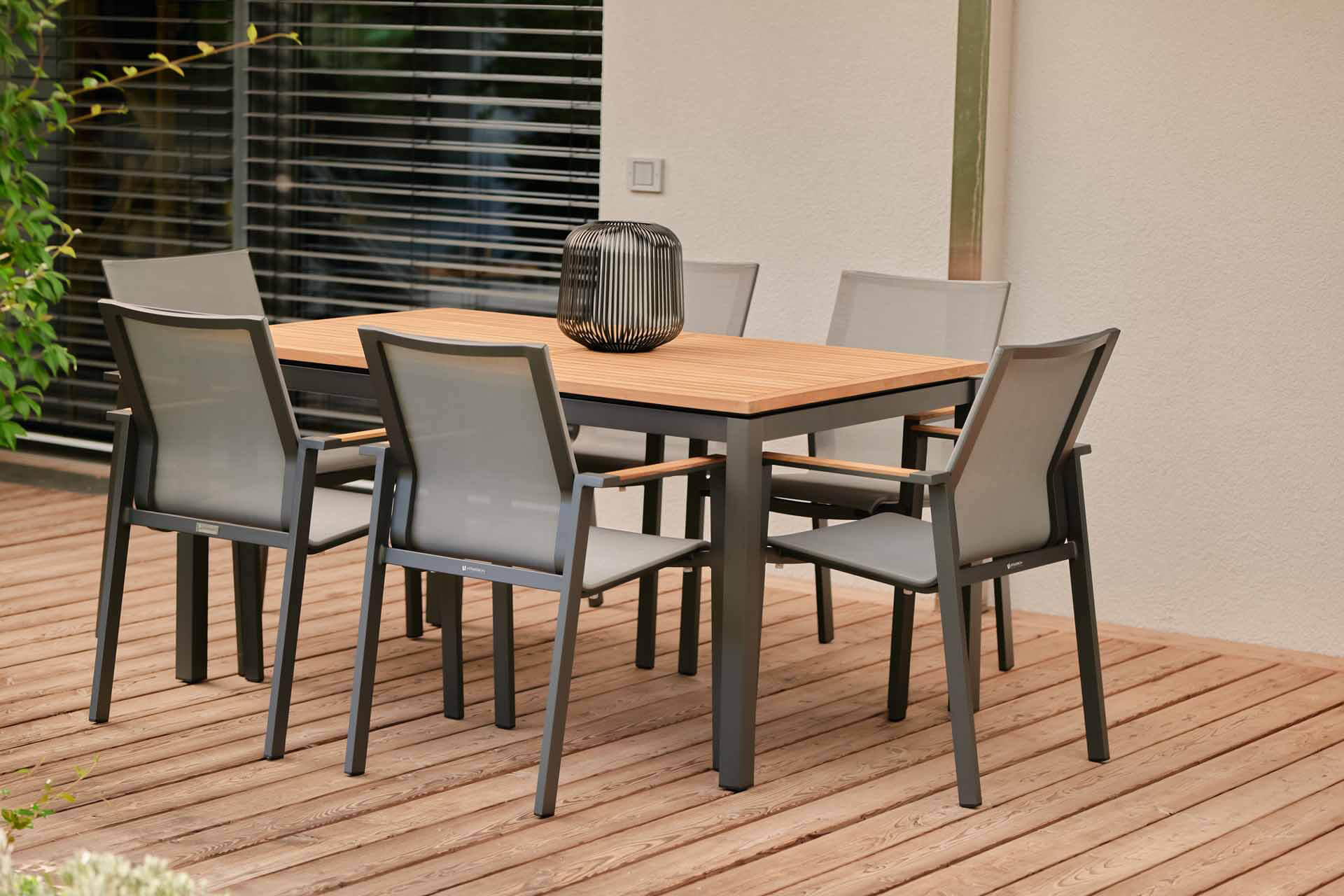 Set Kreta 150/207x90cm grau/Teak + 6 Beja Stapelsessel, Armlehnen Teak