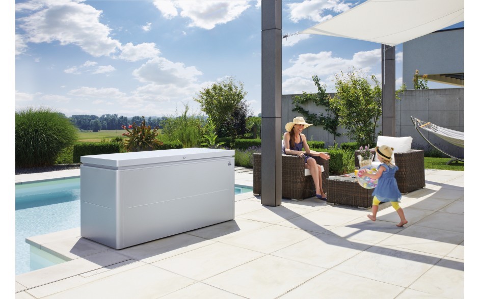 Die LoungeBox® von Biohort ist der perfekte Stauraum für Sitzkissen und andere Dinge, die sonst auf Ihrer Terrasse keinen Platz haben. Durch die ansprechende Optik passt sie perfekt zu allen Outdoor Möbel-Kollektionen. Die aus verzinktem Stahlblech gefertigte Kissentruhe hat die Maße 200x84x88,5cm. Die hochwertige Pulverbeschichtung in dunkelgrau-metallic ergibt die dauerhaft schöne Farbgebung dieser exklusiven Oberfläche. Der abschließbare Deckel der Loungebox ist dank der Gasdruckfeder angenehm sanft zu öffnen, gleichzeitig verhindert die Feder ungewolltes Zufallen. Der matt verchromte Knebel hat eine hochwertige Haptik und die zuverlässige Schließmechanik verstärkt den robusten Eindruck. Ein Reserveschlüssel ist im Lieferumfang enthalten.