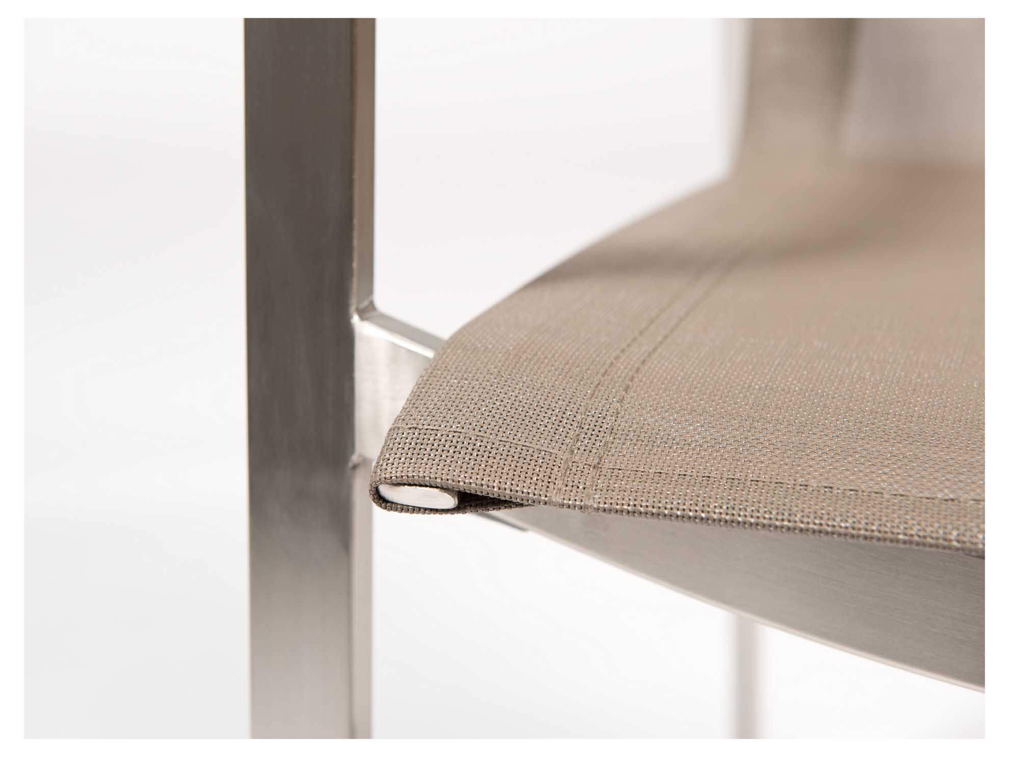 Monaco Stapelsessel aus Edelstahl von Jato & Kebon. Gestell gebürstet, Bespannung aus Jatex-Gewebe in silbergrau. Armlehnen aus Aluminium schwarz pulverbeschichtet.