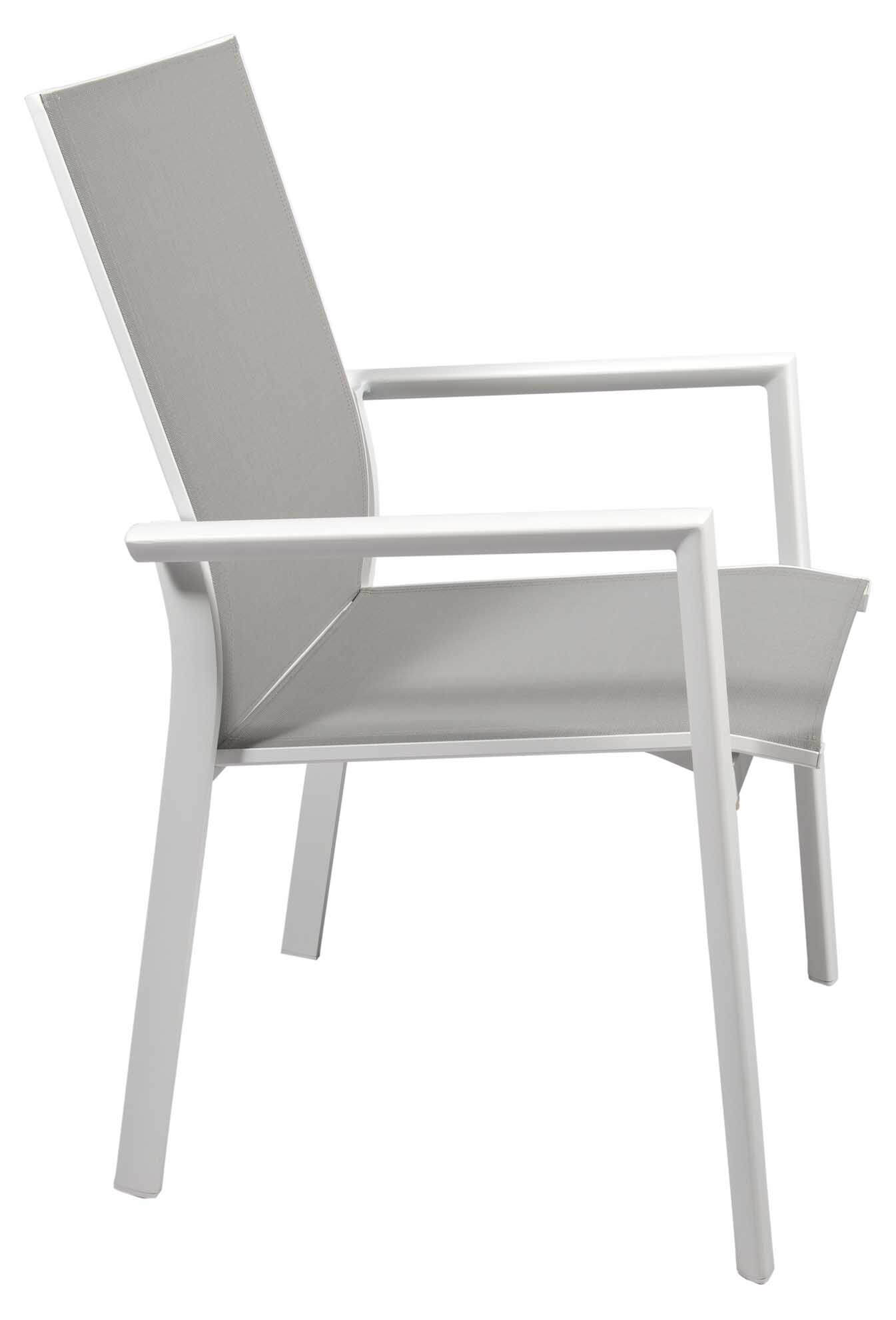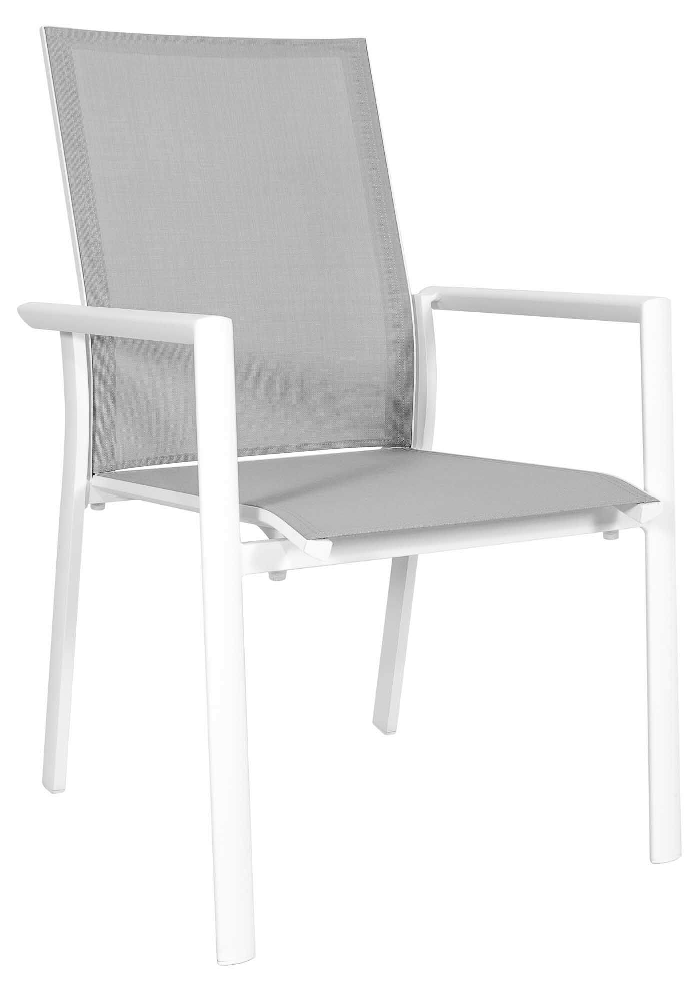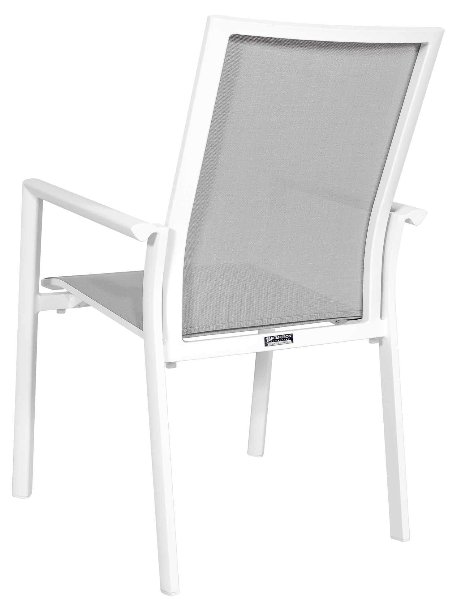 Der robuste Nashville Gartensessel von Jati & Kebon besteht aus einem hochwertigen Aluminiumgestell mit Pulverbeschichtung und einer Bespannung aus Jatex-Gewebe in silbergrau. Für bequemes und entspanntes Sitzen sorgt die ergonomisch geformte und leicht geneigte Rückenlehne. Die Bespannung aus Jatex-Gewebe ist robust und langlebig und auch ohne Kissen sehr bequem. Der Nashville Stapelsessel ist dank hochwertiger Materialien und penibler Verarbeitung absolut wetterfest und ganzjährig einsatzbereit. Bis zu sechs Nashville Sessel können ineinander gestapelt werden.