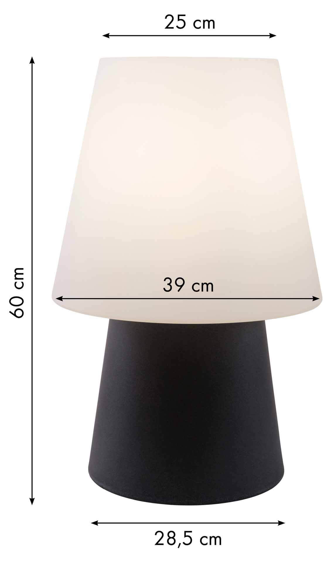 Die moderne Stehleuchte No.1 in der Farbe anthrazit von 8Seasons hat eine Höhe von 60cm und ist sowohl im Außenbereich als auch im Innenbereich verwendbar. Die in Deutschland hergestellte Leuchte hat eine E27 Fassung inklusive RGB Leuchtmittel und besteht aus hochbelastbarem Polyethylen. Das macht sie robust gegenüber Sonne, Regenwetter oder Kälte. Mit der Stehlampe No.1 setzen sie Akzente und sorgen für ein stilvolles Ambiente im Garten oder auf Ihrer Terrasse. Je nach Geschmack lassen sich mit der Fernbedienung die Farben wechseln. Die Leuchte No.1 ist netzbetrieben, die Kabellänge beträgt 235cm. Eine Fernbedienung ist im Lieferumfang enthalten.