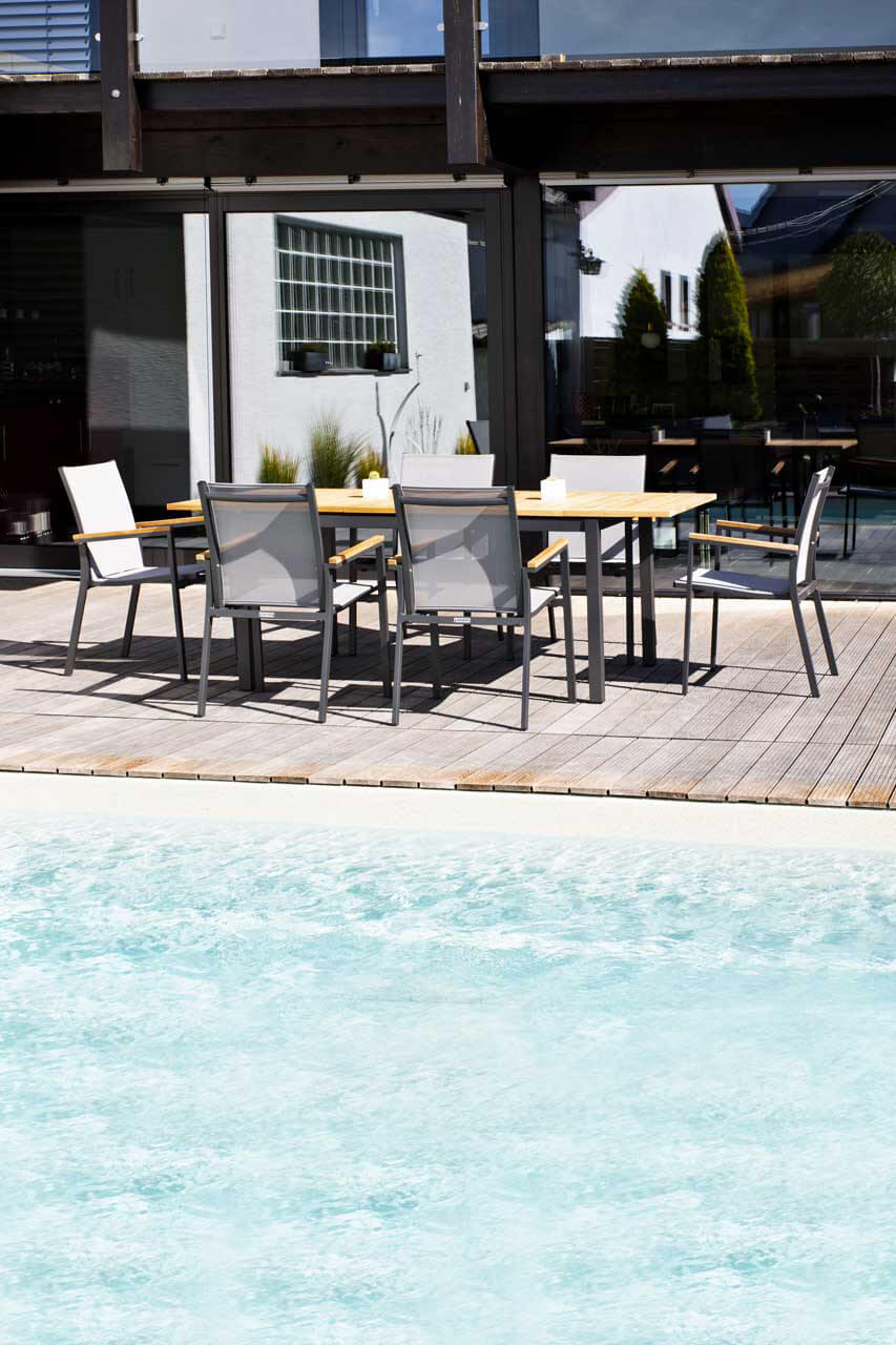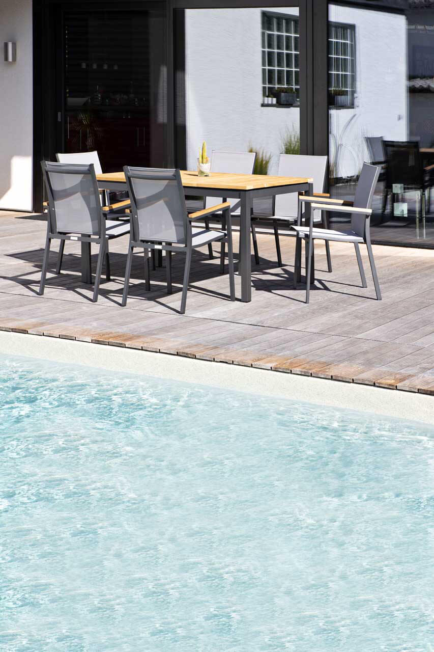 Wir verwenden ausschließlich Teakholz aus kontrolliertem Anbau. Teakholz gehört zu den wertvollsten Nutzhölzern der Welt. Ein hoher Kautschukgehalt bewirkt unter anderem eine starke Wasserabweisung. Das Holz widersteht nicht nur problemlos Nässe, Sonne, Frost und Temperaturschwankungen, sondern besitzt auch eine hohe Resistenz gegen Ungeziefer und Insekten. Teakholz ist zum Dauereinsatz im Freien besonders geeignet. Die meisten Teakmöbel werden naturbelassen geliefert. Im Laufe der Zeit bekommt das Holz durch Witterungseinflüsse eine silbergraue Patina.