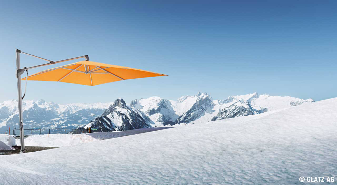 Der SOMBRANO® S+ Sonnenschirm ist ein großer, robuster Freiarmschirm von Glatz mit vielen Verstellmöglichkeiten. Er kann in geöffnetem Zustand um 360° gedreht werden, außerdem lässt sich sein Schirmbach beidseitig um bis zu 54° zum Ausleger neigen. So sorgt er auch bei schräg einfallender Sonne für perfekten Schatten und optimalen Sonnenschutz. Das Öffnen und Schliessen des Schirmes erfolgt leicht und komfortabel per Handkurbel. Der SOMBRANO® eignet sich sowohl für den Einsatz im Privatbereich als auch in der Gastronomie und im öffentlichen Raum. Abhängig von der Größe des Schirmdaches oder der Art der Befestigung kann er selbst bei Windgeschwindigkeiten von bis zu 45km/h genutzt werden (Details finden Sie in den technischend Daten). Das Schirmgestell und die Streben des Schirmdaches bestehen beim SOMBRANO® S+ aus Aluminium. Beim Schirmdach stehen verschiedene Farben und Stoffqualitäten zur Auswahl. Weitere Details zur hier verwendeten Stoffklasse finden Sie unter "Material & Pflege". Eine Schutzhülle aus Polyester mit Stab und Reißverschluß gehört zum Lieferumfang des Schirmes. Zur Befestigung stehen verschiedene Schirmständer, Rollensockel, Bodenhülsen und Wandbefestigungen zur Auswahl (nicht im Lieferumfang enthalten).