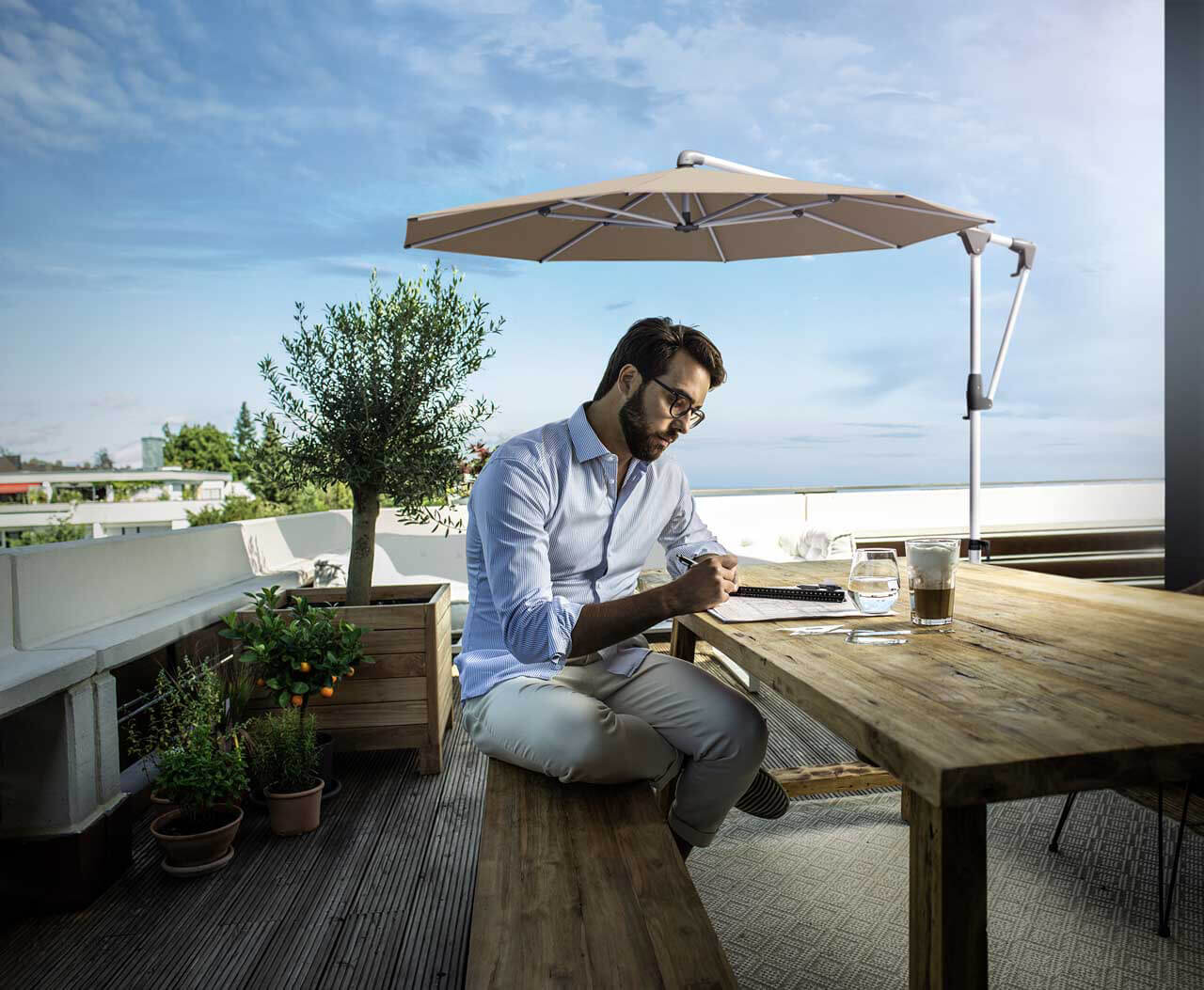 Der SUNWING® CASA Sonnenschirm ist ein moderner Ampelschirm von Glatz. Er ist in verschiedenen Größen und Formen in rund, rechteckig oder quadratisch lieferbar. Sein Gestell besteht aus Aluminium und ist wahlweise silber eloxiert oder anthrazit pulverbeschichtet.