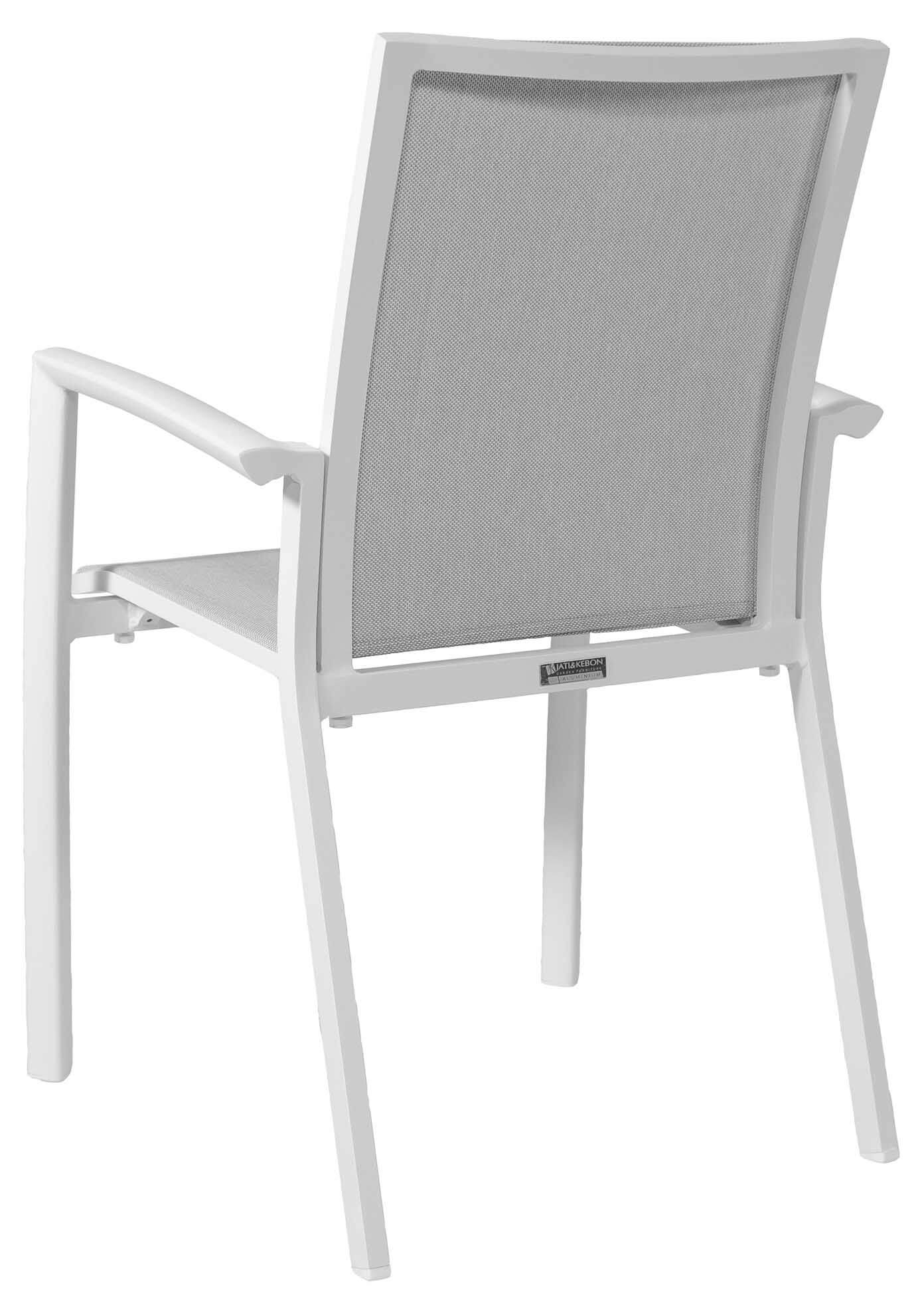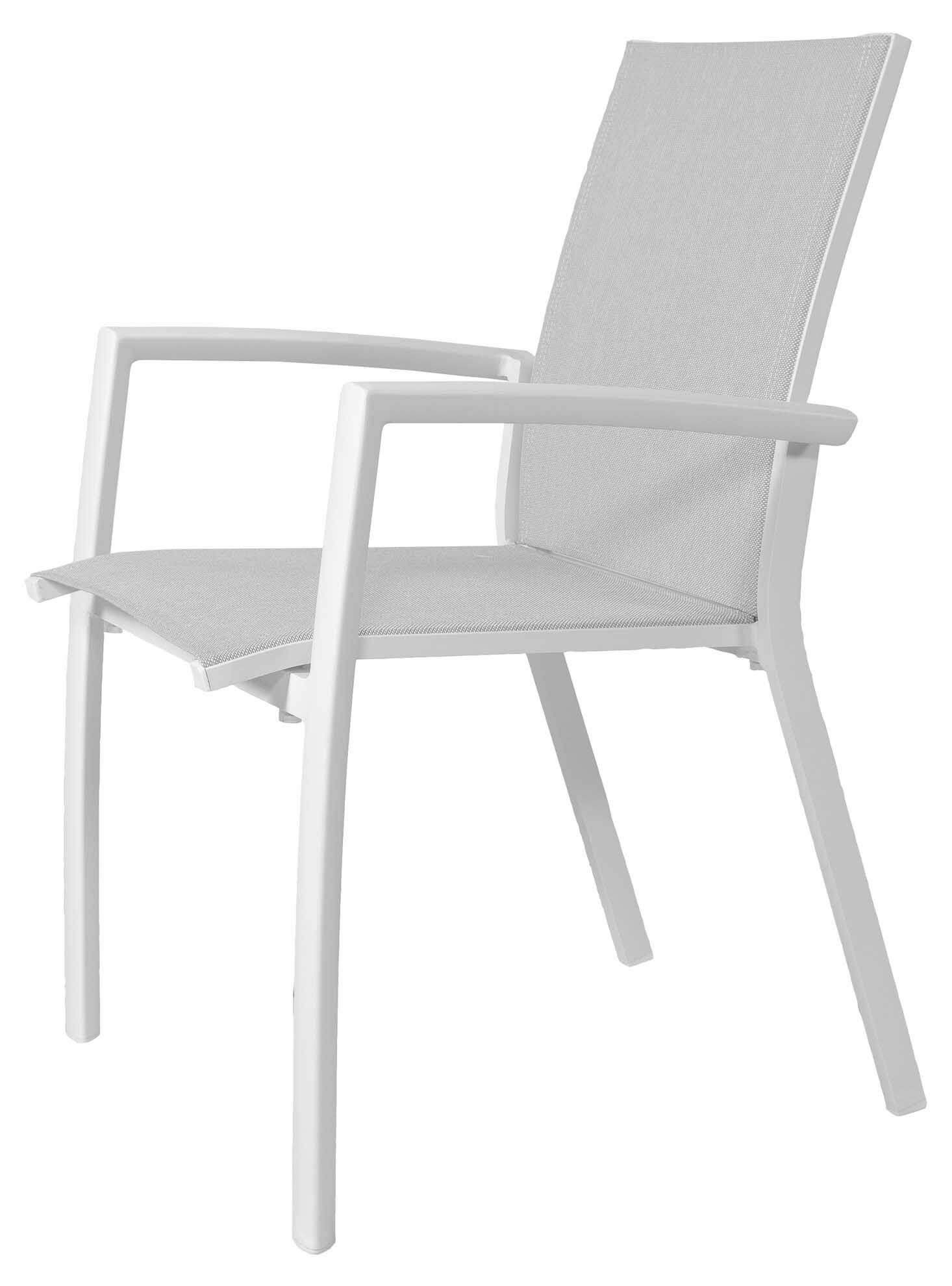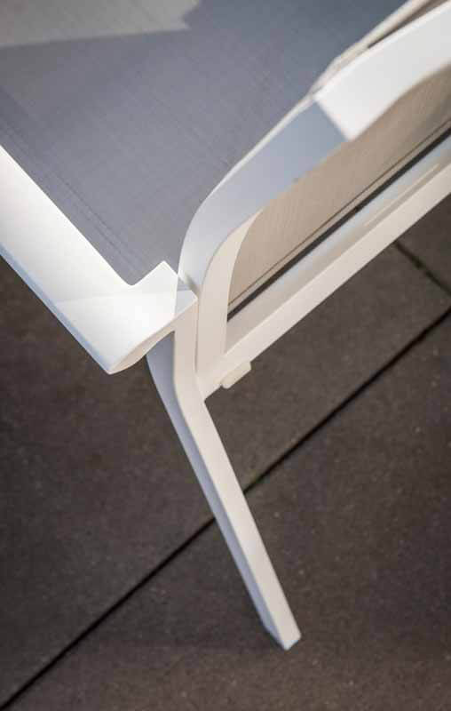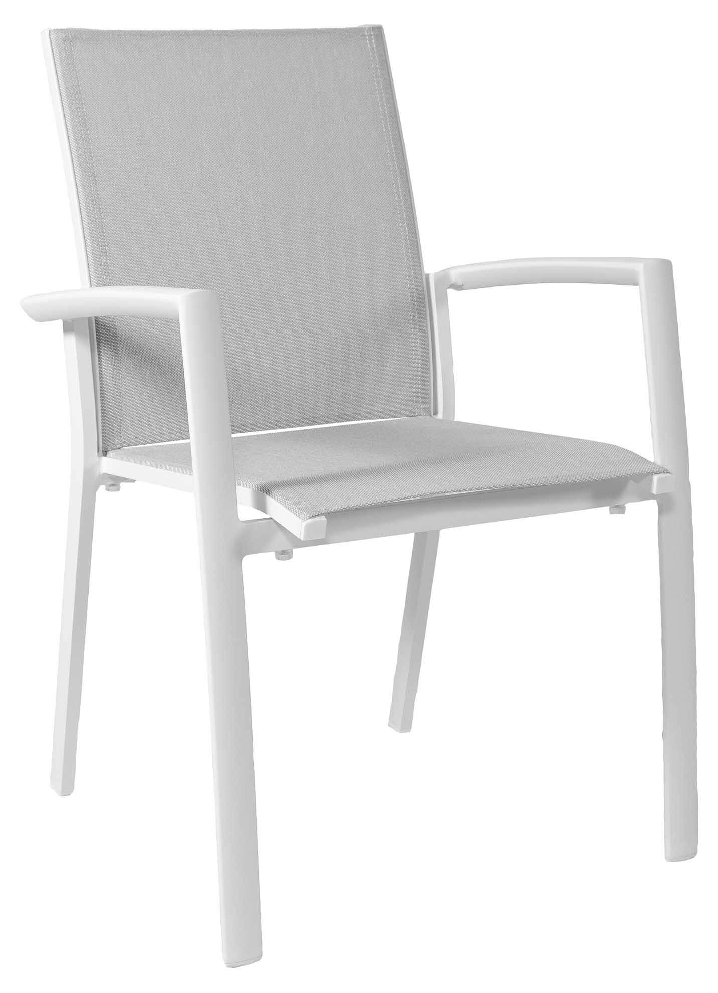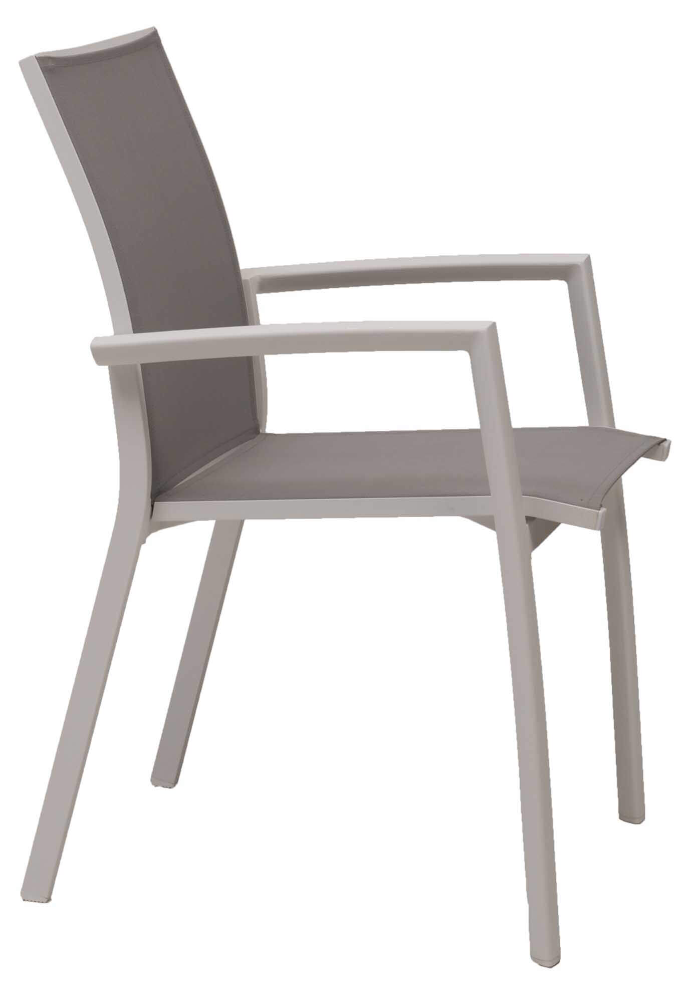 Sevilla Stapelsessel von Jati & Kebon mit hoher Rückenlehne, Gestell Aluminium eisengrau pulverbeschichtet mit Jatex-Bespannung in silbergrau. Ohne Kissen.