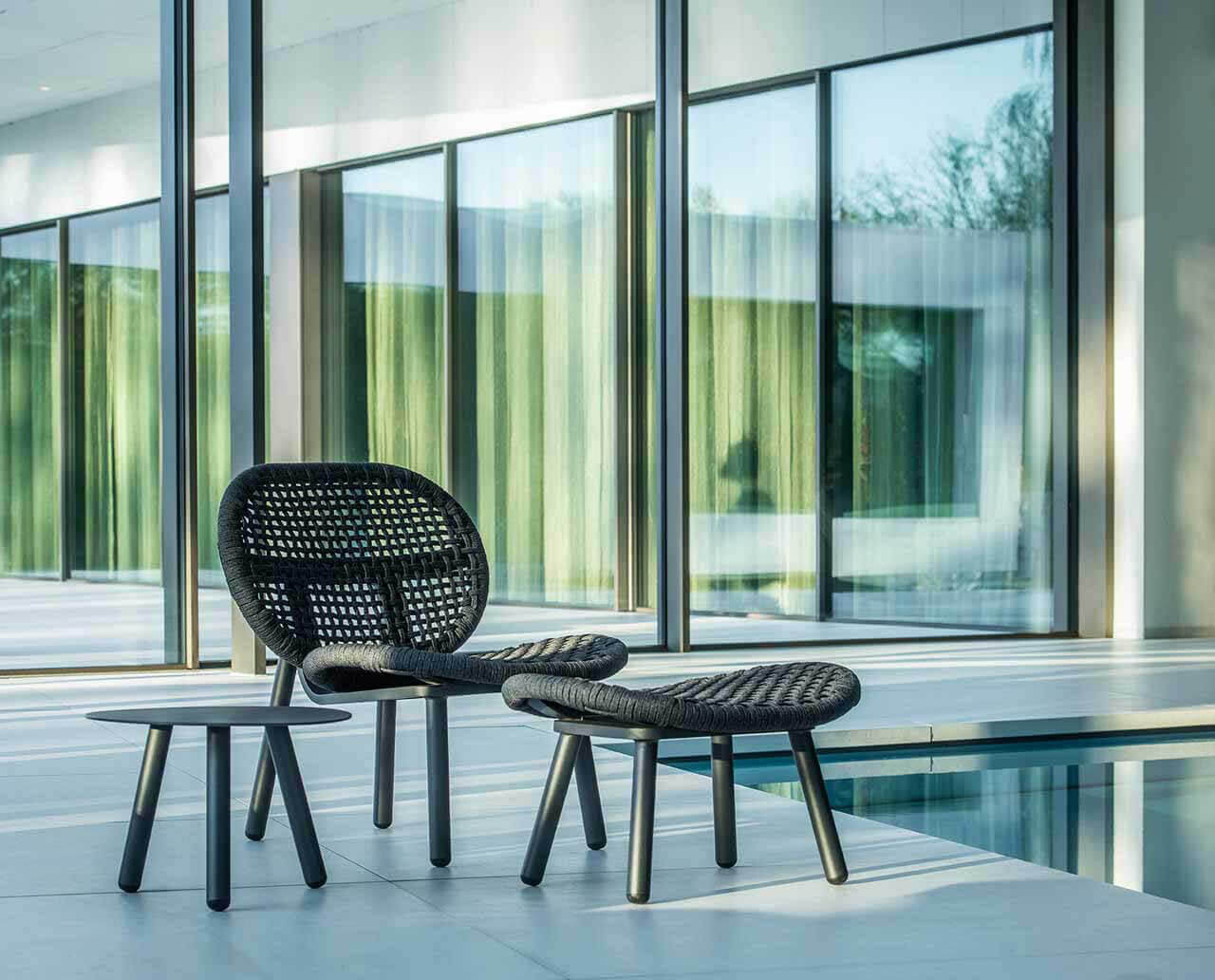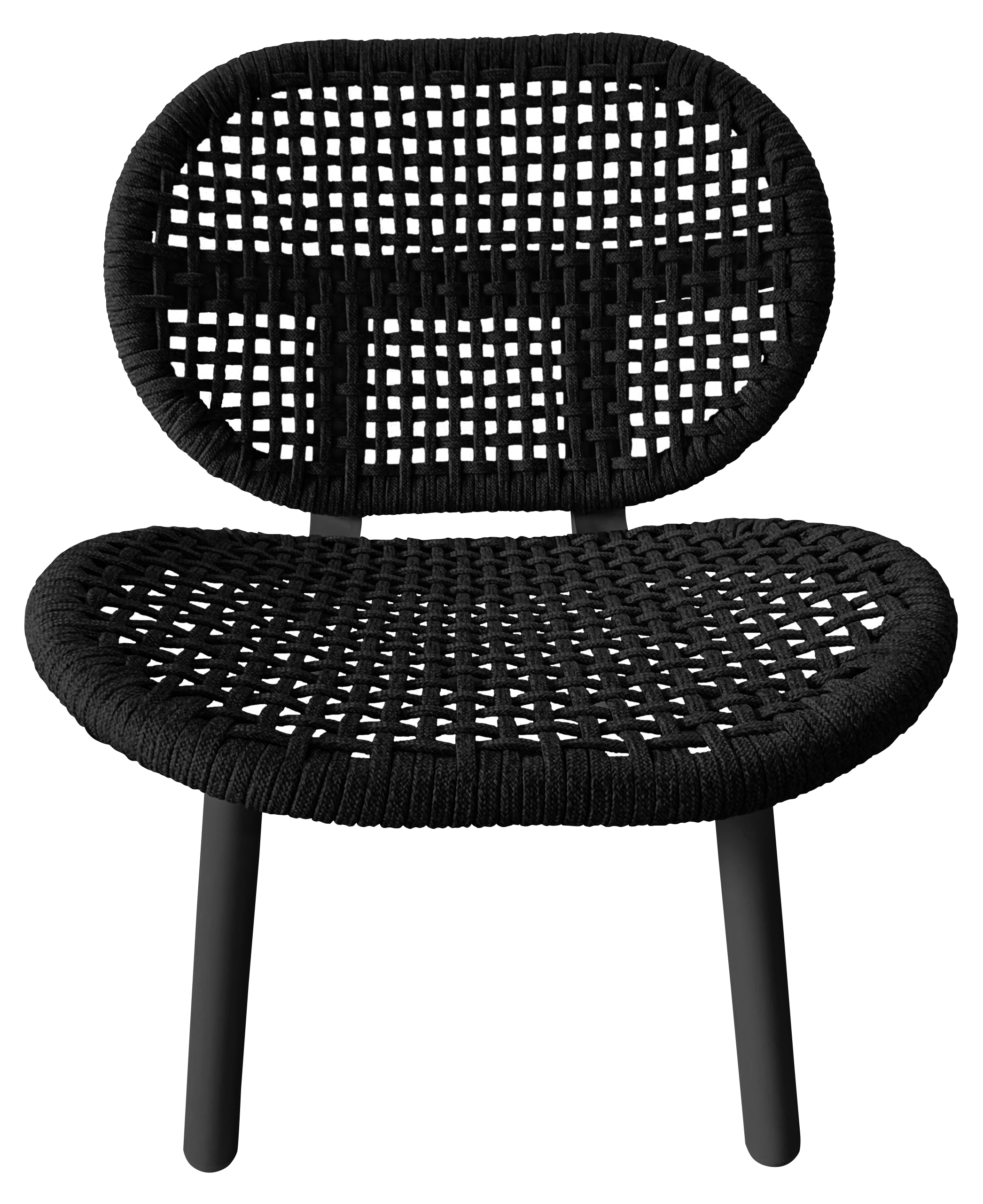 Skate Lounge Sessel aus Aluminium mit Flechtung. Gestell eisengrau matt pulverbeschichtet, Geflecht in Farbe charcoal (Offene Flechtung)