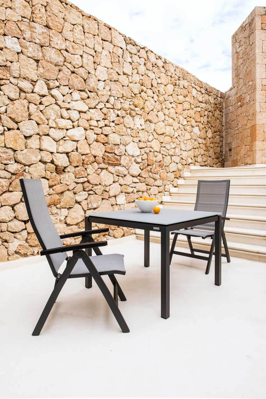 Tinos ist ein moderner Verstellsessel aus Aluminium mit bequemer Bespannung aus Jatex Gewebe in der Farbe silbergrau. Sein Rückenlehne kann über ein Raster in den Armlehnen mehrfach in der Neigung verstellt werden. So kann der Tinos Sessel als vollwertige Sitzgelegenheit am Esstisch genutzt werden und verwandelt sich mit einem Handgriff in einen bequemen Liegestuhl. Einfach die Armlehnen anheben und die Rückenlehne nach hinten gleiten lassen und die Sonne geniessen. Als perfekte Ergänzung finden Sie unter "Zubehör" den passenden Tinos Fußhocker. Das Gestell und die Armlehnen des Tinos Verstellsessels bestehen aus Aluminium. Die Bespannung aus Jatex Gewebe ist robust, bequem und pflegeleicht. Der Sessel kann platzsparend flach zusammengeklappt werden.