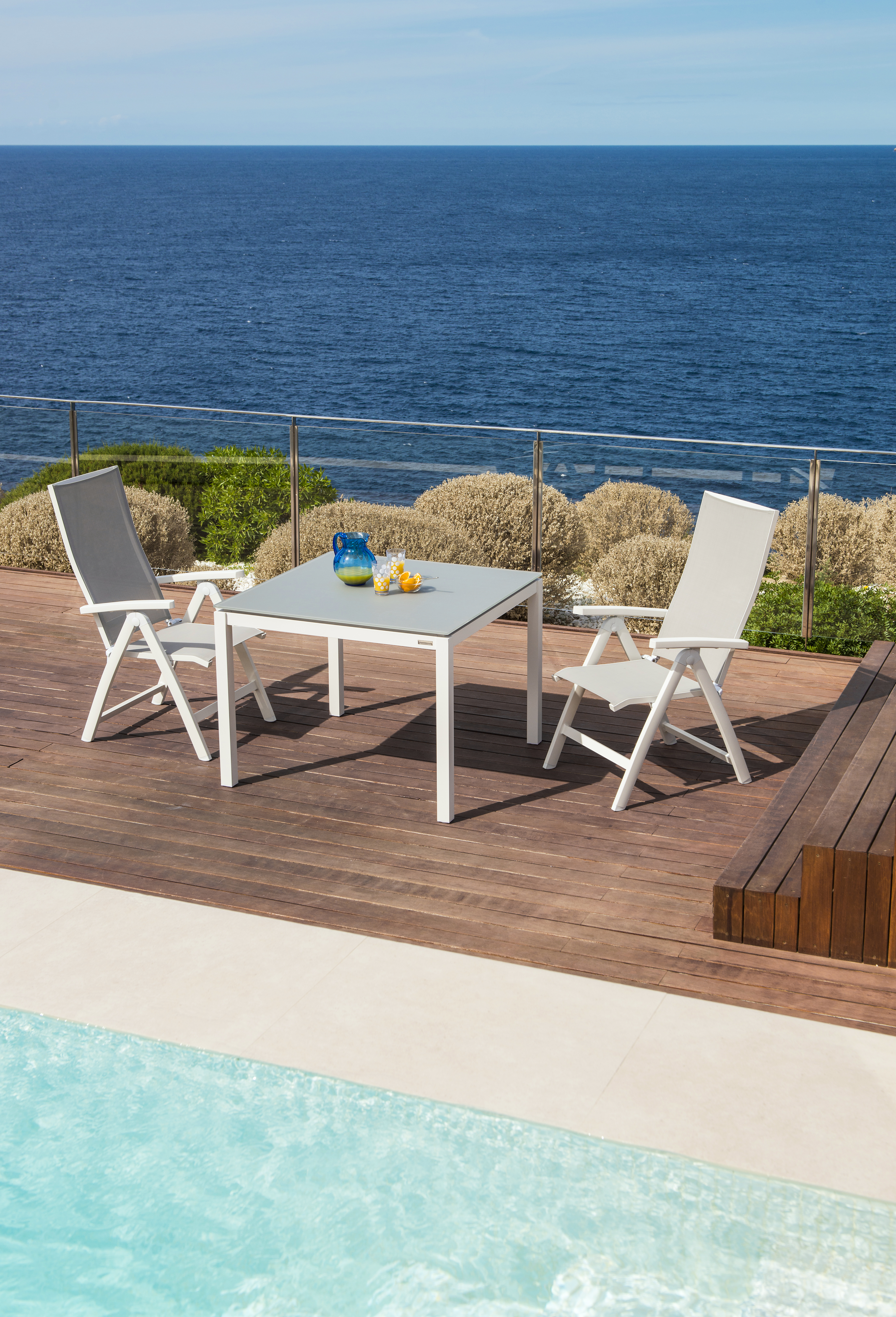Tinos ist ein moderner Verstellsessel aus Aluminium mit bequemer Bespannung aus Jatex Gewebe in der Farbe silbergrau. Sein Rückenlehne kann über ein Raster in den Armlehnen mehrfach in der Neigung verstellt werden. So kann der Tinos Sessel als vollwertige Sitzgelegenheit am Esstisch genutzt werden und verwandelt sich mit einem Handgriff in einen bequemen Liegestuhl. Einfach die Armlehnen anheben und die Rückenlehne nach hinten gleiten lassen und die Sonne geniessen. Als perfekte Ergänzung finden Sie unter "Zubehör" den passenden Tinos Fußhocker. Das Gestell und die Armlehnen des Tinos Verstellsessels bestehen aus Aluminium. Die Bespannung aus Jatex Gewebe ist robust, bequem und pflegeleicht. Der Sessel kann platzsparend flach zusammengeklappt werden.