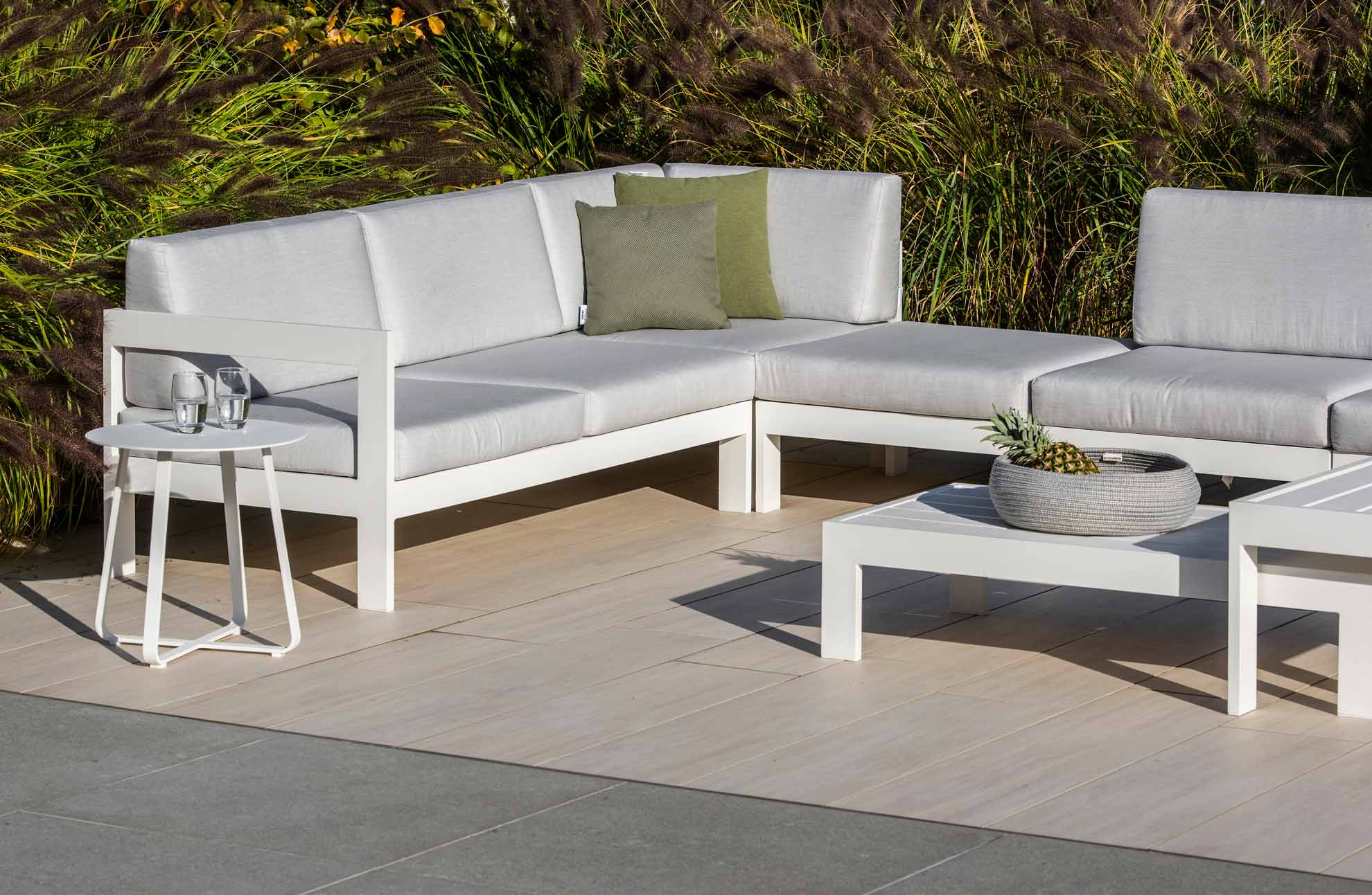 Der Vigo Lounge Modulsystem Seitenteil rechts von Jati & Kebon besteht aus einer schlanken Aluminiumkonstruktion. Die bewusst reduzierte Form auf das Wesentliche wirkt modern und stilvoll. Die Farbe „eisengrau“ wird durch eine strapazierfähige Pulverbeschichtung aufgetragen, die witterungsresistent und pflegeleicht ist. Die Breite dieses Modulsystems beträgt 154,5cm, die Tiefe 78,5cm. Die Gesamthöhe ist 61cm. Das Vigo Modulsystem kann mit anderen Elementen dieser Serie erweitert werden, daher können Sie die Größe Ihrer Vigo-Loungegarnitur je nach Platzbedarf selbst bestimmen. Maßgefertigte Sitzkissen in unterschiedlichen Farben finden Sie unserem Zubehörprogramm.