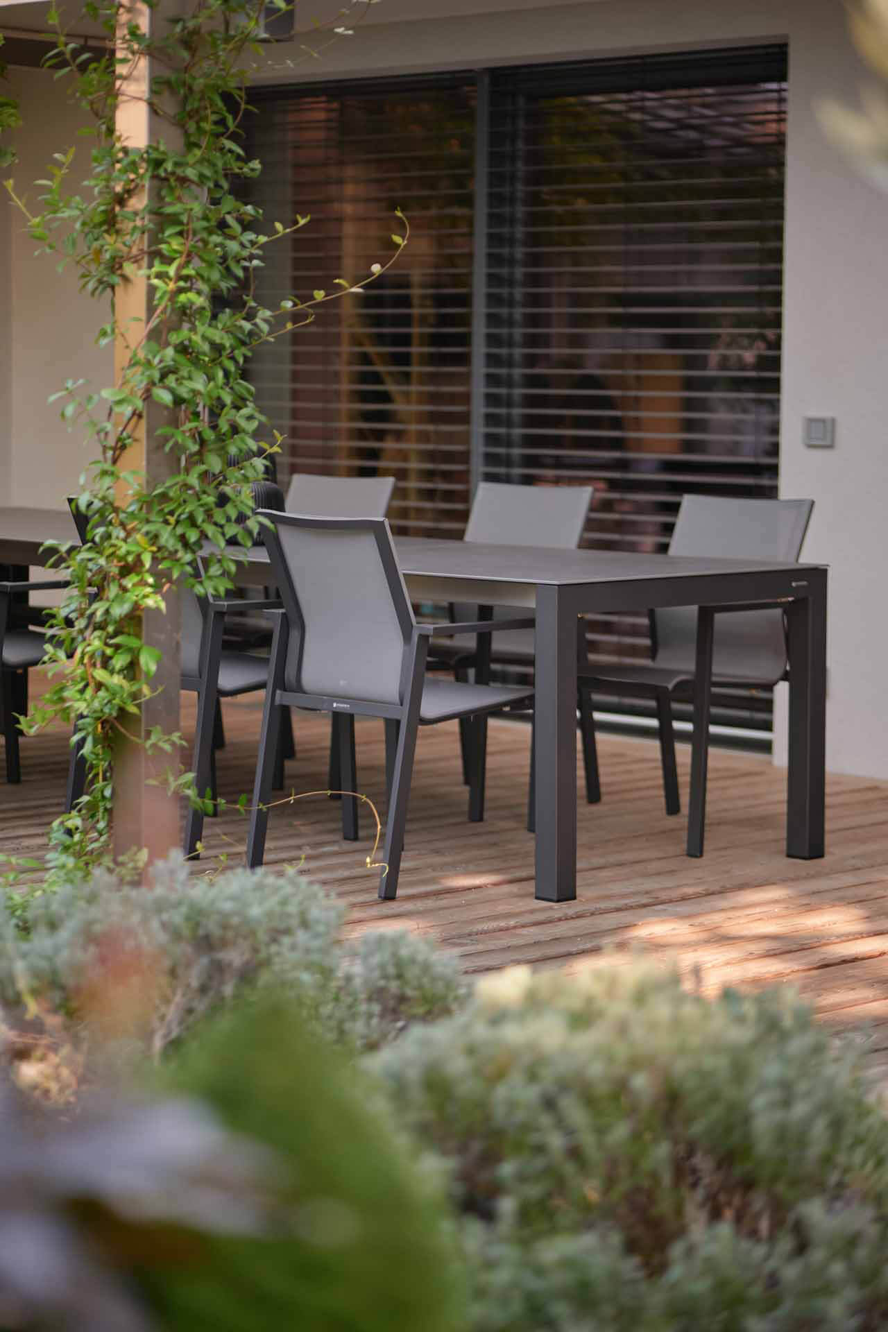 Der robuste Beja Gartensessel von Jati & Kebon besteht aus einem hochwertigen Aluminiumgestell mit Pulverbeschichtung und einer Bespannung aus Jatex-Gewebe. Die Armlehnen aus Teakholz sind ein visuelles sowie haptisches Highlight, das den eleganten Look des Stuhls noch abrundet. Armlehnen aus Holz sorgen nicht nur für ein angenehmes, natürliches Sitzgefühl sondern werden auch bei starker Sonneneinstrahlung nicht heiß. Für bequemes und entspanntes Sitzen sorgt auch die ergonomisch geformte und leicht geneigte Rückenlehne. Die Bespannung aus Jatex-Gewebe ist robust und langlebig und auch ohne Kissen sehr bequem. Der Beja Stapelsessel ist dank hochwertiger Materialien und penibler Verarbeitung absolut wetterfest und ganzjährig einsatzbereit. Bis zu sechs Beja Sessel können ineinander gestapelt werden.
