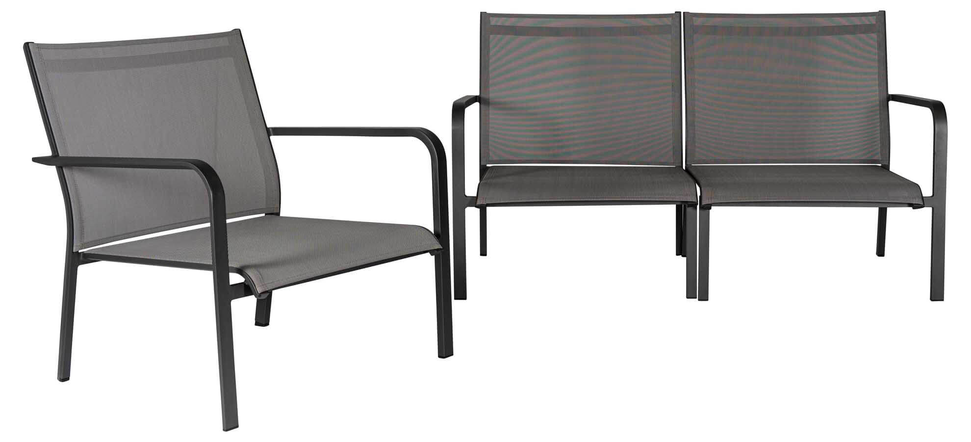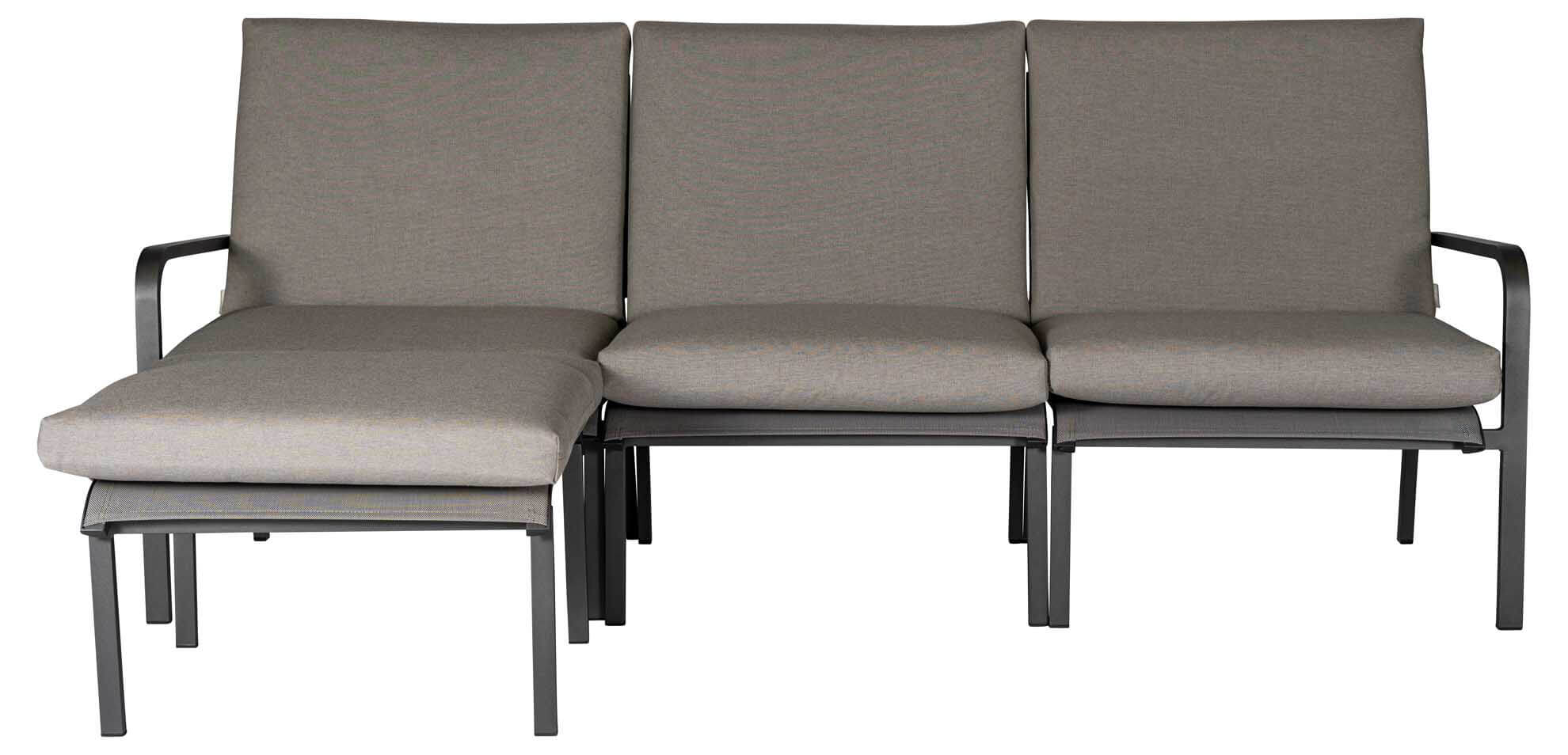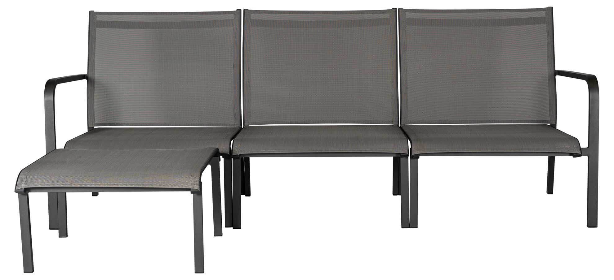 Dieses leichte Dransy Lounge-Set von Jati&Kebon besteht aus folgenden Teilen: 1 x Seitenteil rechts 1 x Seitenteil links 1 x Mittelteil 1 x Hocker Das Aluminium Gestell ist pulverbeschichtet in der Farbe eisengrau, die Bespannung der Sitz- und Rückenfläche ist silbergrau. Durch das robuste Jatex-Gewebe und die hochwertige Oberfläche des Aluminiumgestells ist das Dransy Lounge Modul perfekt für den Outdoor Bereich geeignet und trotzt allen Wetterbedingungen.