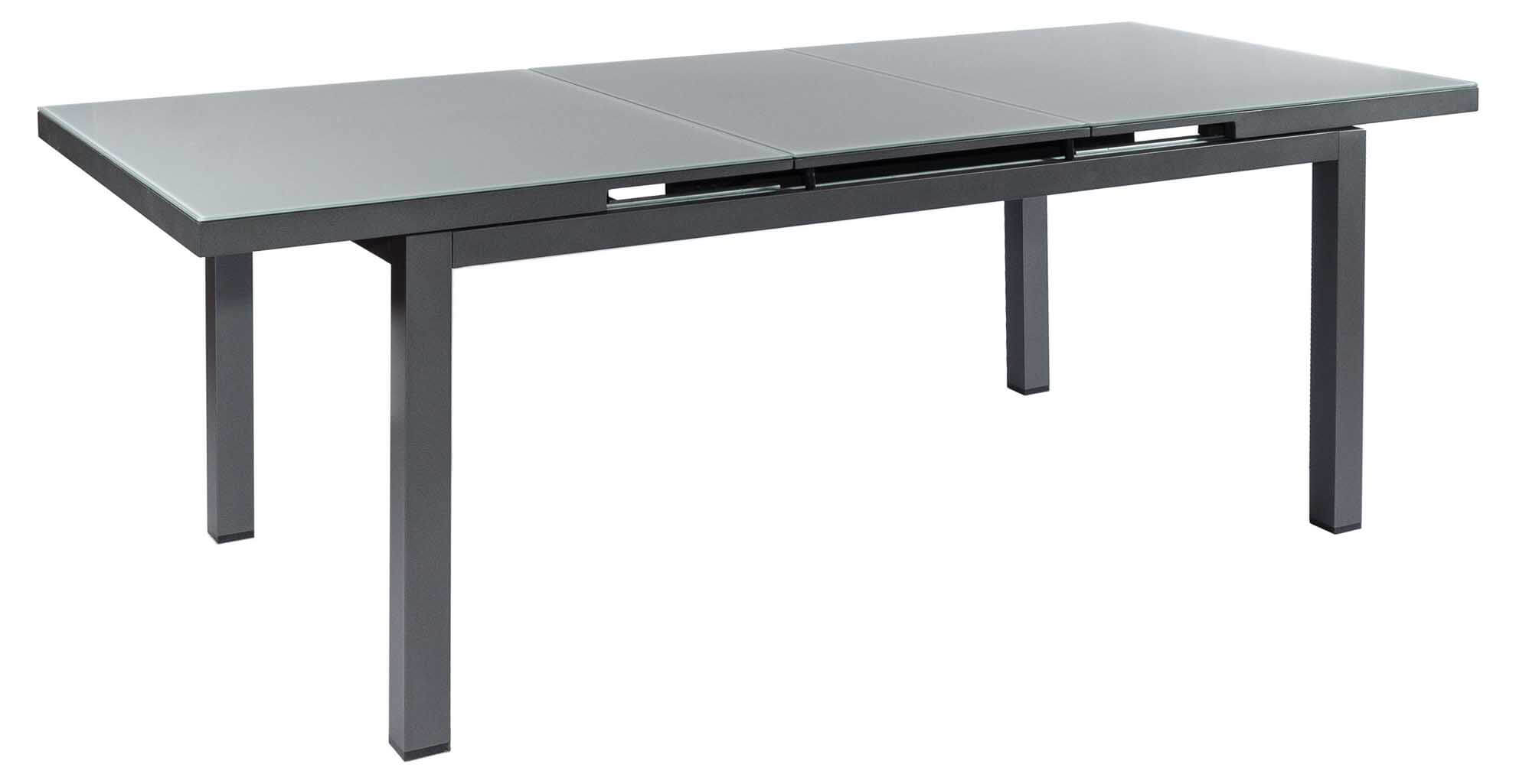 Der Ausziehtisch Gabon von Jati & Kebon hat eine Größe von 160x90 cm. Durch einen Synchronauszug mit Hubplatte ist er mit wenigen Handgriffen ausziehbar auf 210 cm und bietet Platz für bis zu 8 Personen. Das Tischgestell besteht aus pulverbeschichtetem Aluminium in "eisengrau". Die Tischplatte besteht aus satiniertem Glas in "hellgrau" . Diese Materialkombination ist äusserst robust und eignet sich hervorragend für die Nutzung im Aussenbereich.
