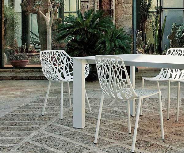 Forest Stühle sind aus Druckguss-Aluminium gefertigt. Die in mehreren Farben mit dem unverwechselbaren Waldmuster erhältliche Stuhlkollektion ist für den Einsatz im Freien und für gesellige Anlässe gedacht: Drinks, ein Brunch oder ein gemütliches Abendessen - Die stapelbaren Stühle lassen sich zu allen Esstischen drinnen oder draußen kombinieren. Zudem sind die Stühle durch die hochwertige Pulverbeschichtung gegen alle Witterungsbedingungen geschützt und können problemlos im Freien verbleiben.
