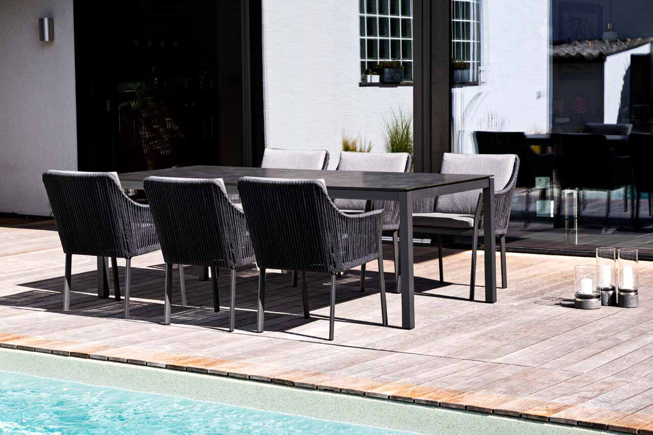 Das Aluminium Tischgestell aus der Serie Lugo von Jati & Kebon ist vorgesehen für nicht ausziehbare Tischplatten der Größe 90x90cm mit einer Höhe von 74cm. Die Tischbeine sind abschraubbar und die Oberfläche besteht aus einer Pulverbeschichtung der Farbe „eisengrau“. Eine große Anzahl an Tischplatten in unterschiedlichen Materialien und Farben ermöglicht Ihnen die Gestaltung eines ganz persönlichen Gartentisches. Die Tischplatten aus HPL, Dekton® oder Keramik sind wetterfest und deshalb hervorragend für den Aussenbereich geeignet. Wählen Sie einfach eine Farbe nach Ihrem ganz persönlichem Geschmack.