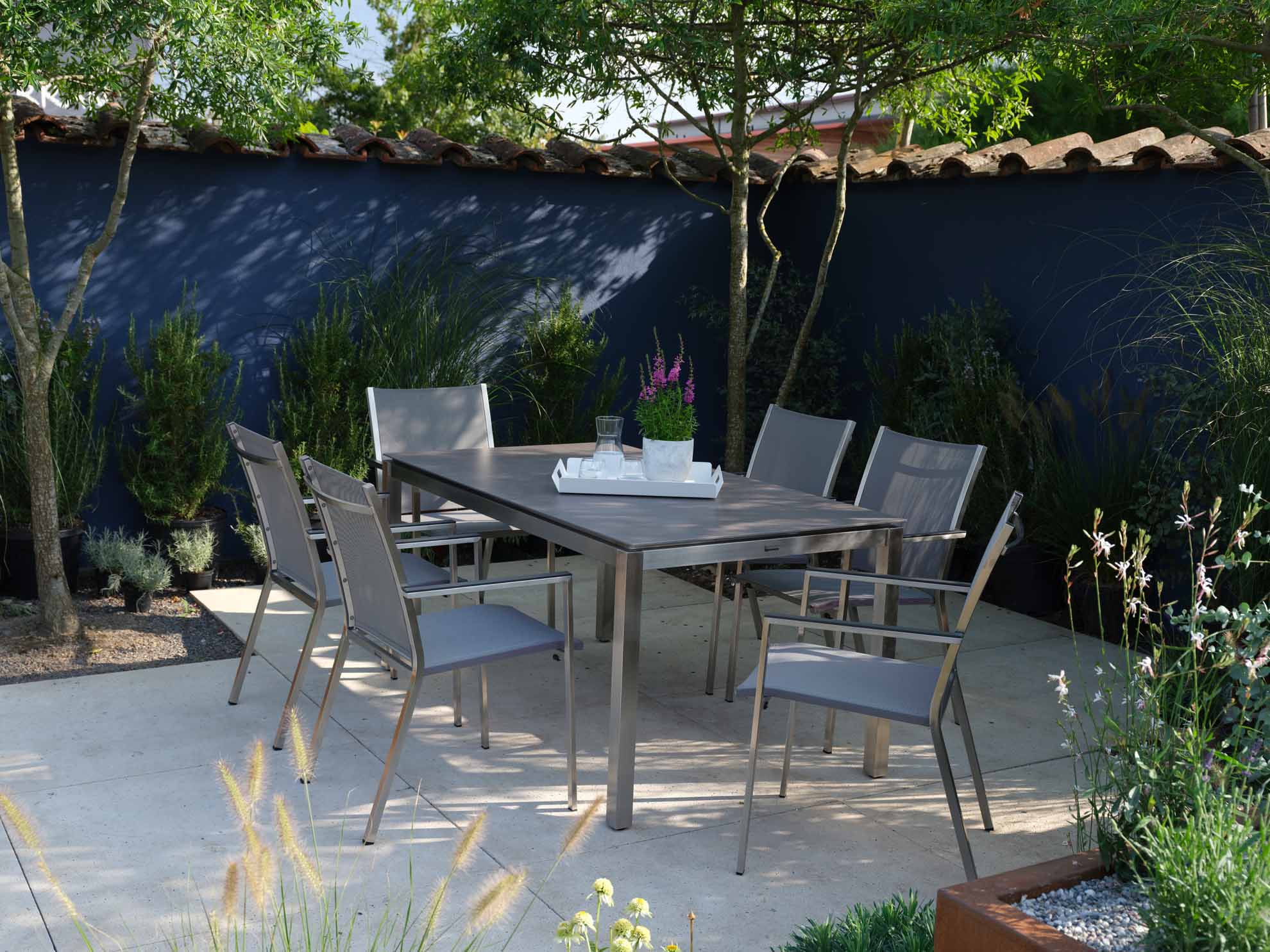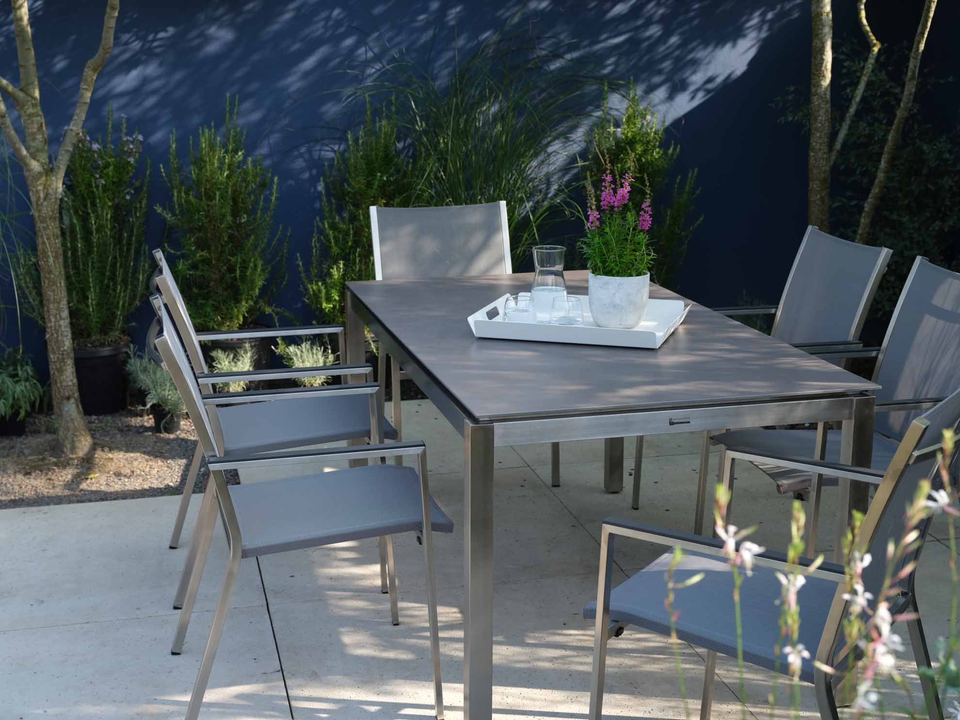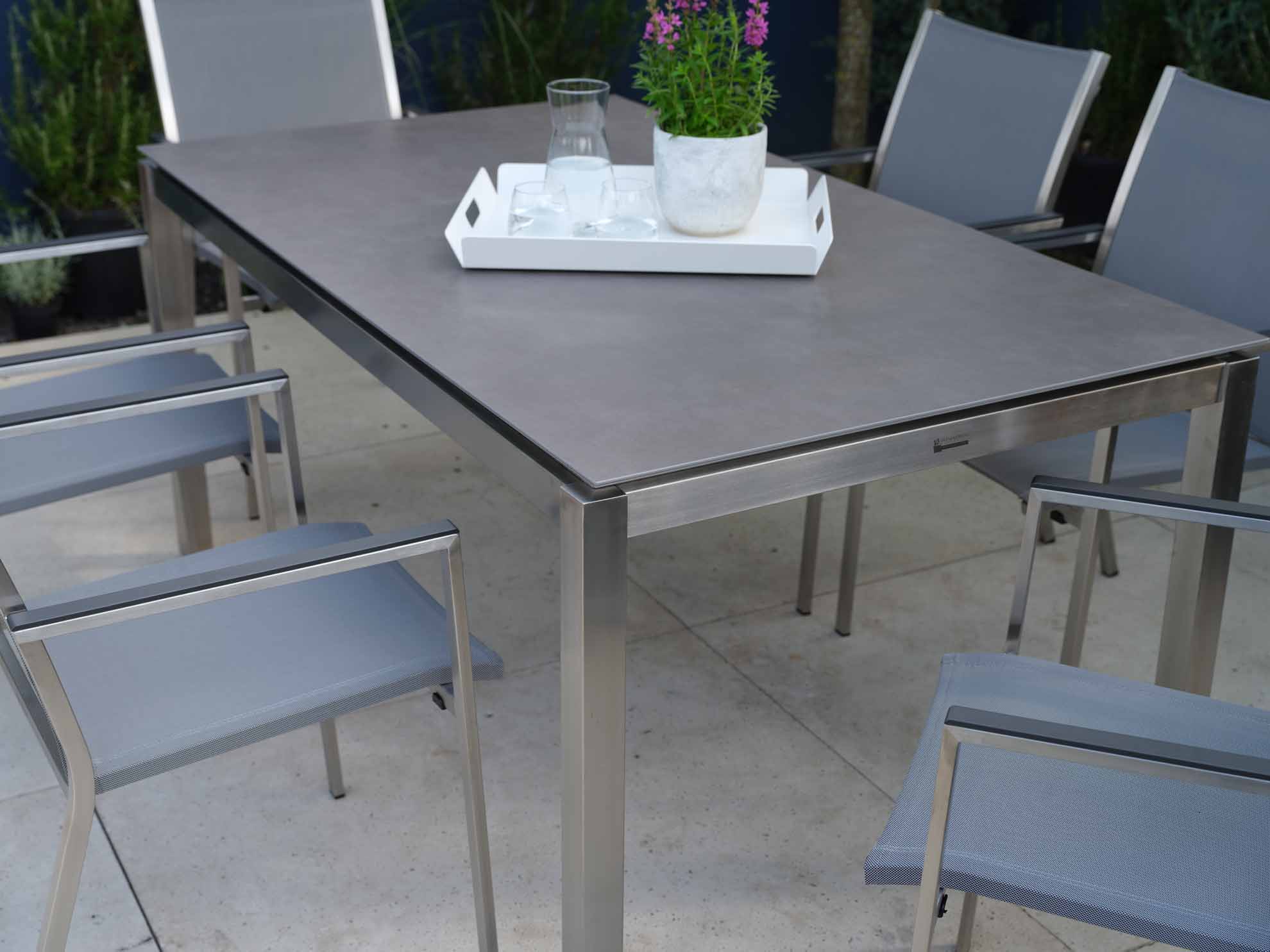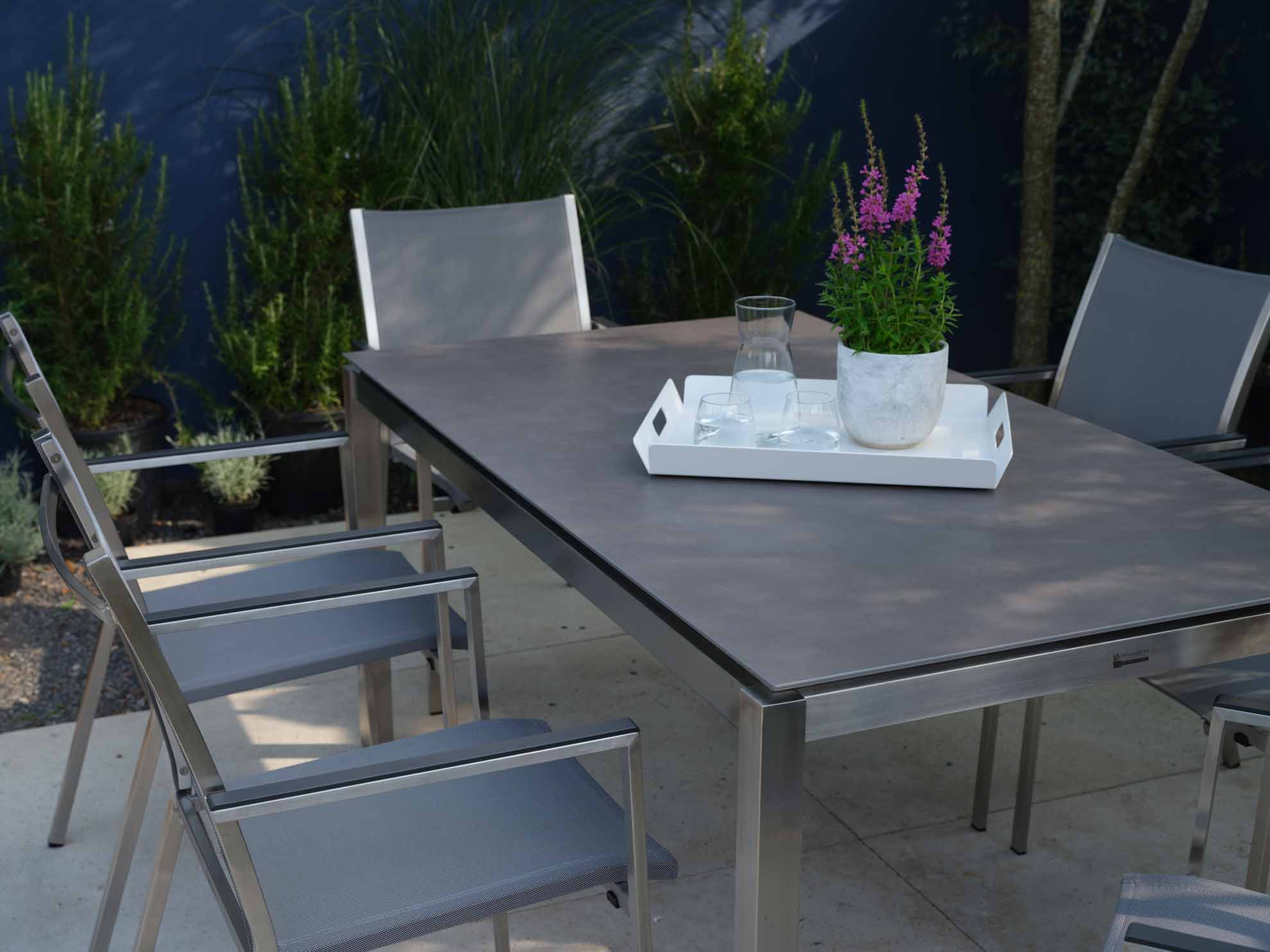 Gartenmöbel aus Edelstahl sind nicht nur wetterbeständig, sondern auch äußerst strapazierfähig. Das Material ist sehr stabil, deshalb können Edelstahl-Gartenmöbel mit viel kleineren Profilen hergestellt werden und wirken deutlich filigraner als andere Materialien. Die gebürstete Oberfläche verleiht dem Möbelstück eine exklusive Anmutung. Edelstahl ist unempfindlich gegen Schäden durch Anstoßen und Verkratzen, da die Oberfläche nicht lackiert ist. Kleine Beschädigungen können einfach mit einem metallfreien Reinigungsvlies bearbeitet werden. Die Edelstahl-Gartenmöbel in unserem Sortiment sind nicht für den Einsatz in Hallenbädern oder in Küstennähe am Meer geeignet!