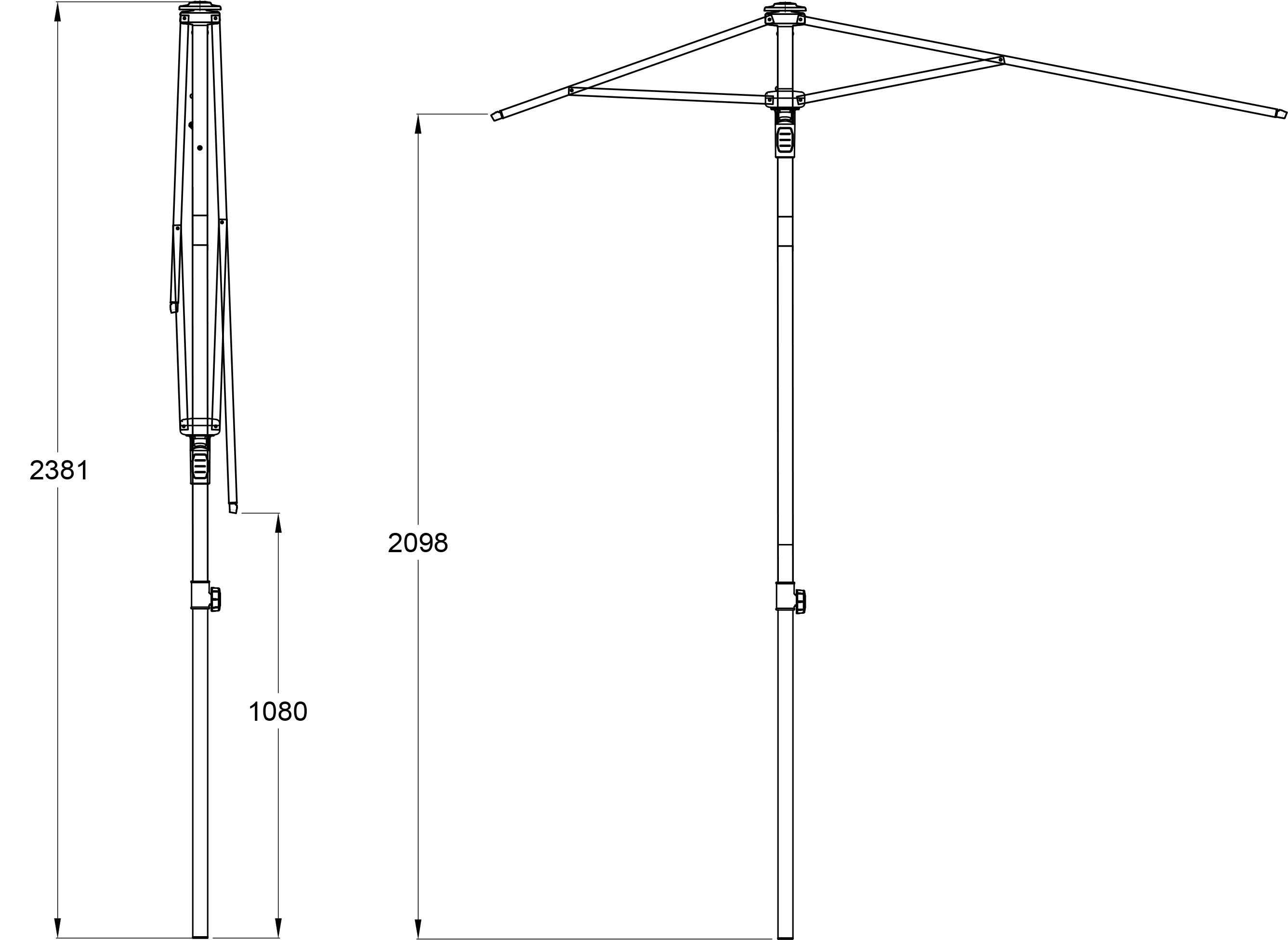 • UNO: Pulverbeschichtetes Aluminium, Streben 14×20 mm, selbstspannende Strebenenden für ein dauerhaft straffes Schirmdach.