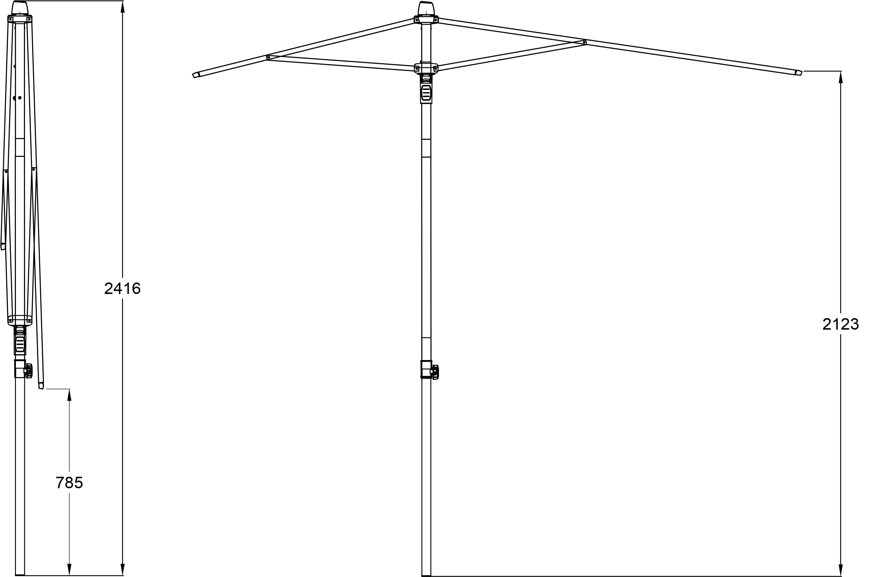 UNO: Pulverbeschichtetes Aluminium, Streben 14×20 mm, selbstspannende Strebenenden für ein dauerhaft straffes Schirmdach.