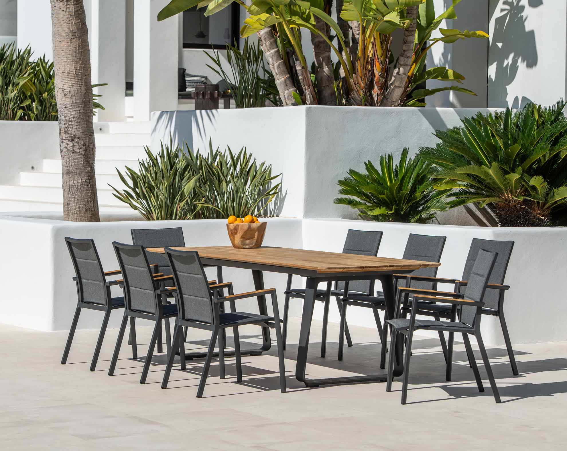 Wir verwenden ausschließlich Teakholz aus kontrolliertem Anbau. Teakholz gehört zu den wertvollsten Nutzhölzern der Welt. Ein hoher Kautschukgehalt bewirkt unter anderem eine starke Wasserabweisung. Das Holz widersteht nicht nur problemlos Nässe, Sonne, Frost und Temperaturschwankungen, sondern besitzt auch eine hohe Resistenz gegen Ungeziefer und Insekten. Teakholz ist zum Dauereinsatz im Freien besonders geeignet. Die meisten Teakmöbel werden naturbelassen geliefert. Im Laufe der Zeit bekommt das Holz durch Witterungseinflüsse eine silbergraue Patina.